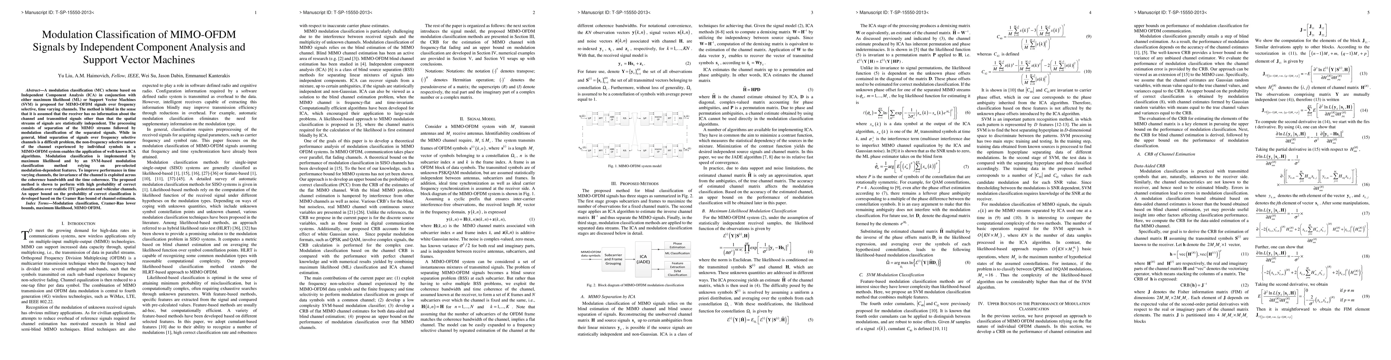 This paper proposes a modulation classification scheme for MIMO-OFDM signals using Independent Component Analysis (ICA) combined with either maximum likelihood or Support Vector Machines (SVM). The method achieves high classification accuracy over time-varying channels by exploiting channel invariance and statistical independence of spatial streams.
