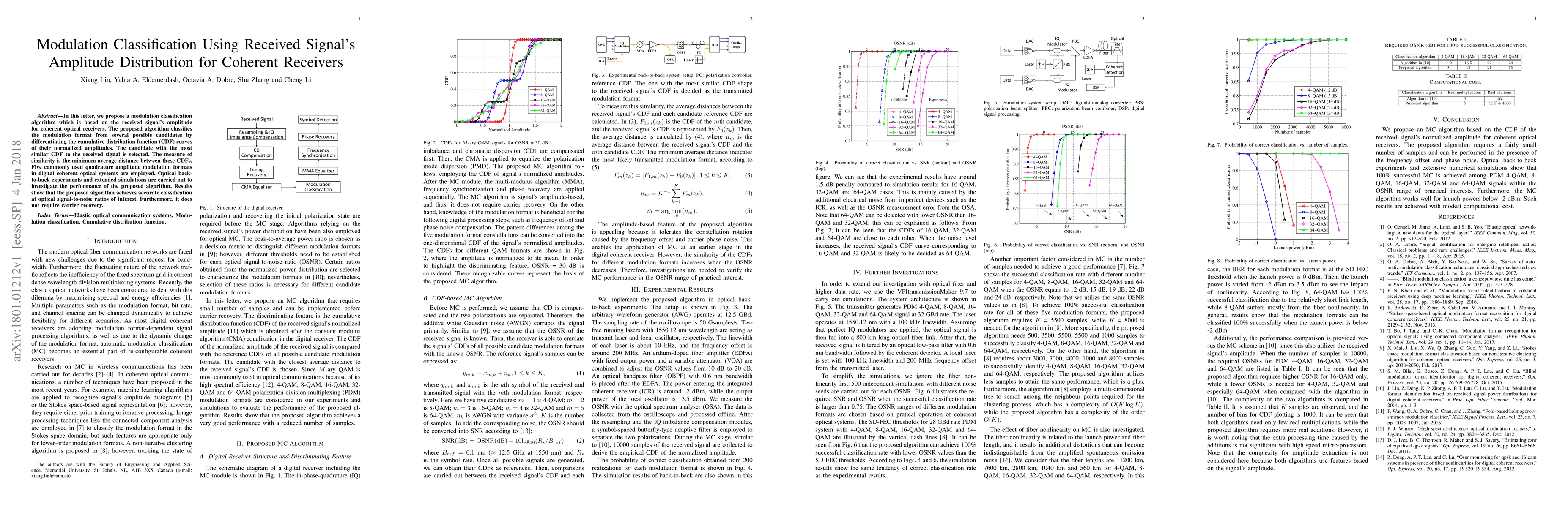 A new modulation classification algorithm is proposed for coherent optical receivers using received signal amplitude distribution, achieving accurate classification at low signal-to-noise ratios without carrier recovery.