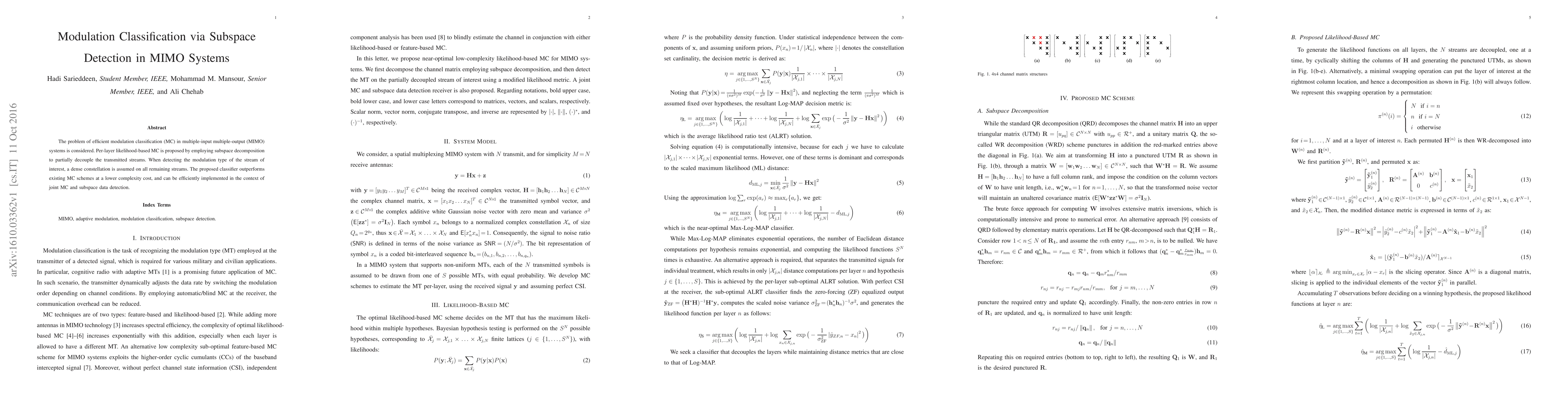 This paper proposes a subspace decomposition-based method for efficient modulation classification in MIMO systems, achieving superior performance with lower complexity compared to existing schemes. The approach leverages likelihood-based classification and assumes dense constellations on non-target streams.
