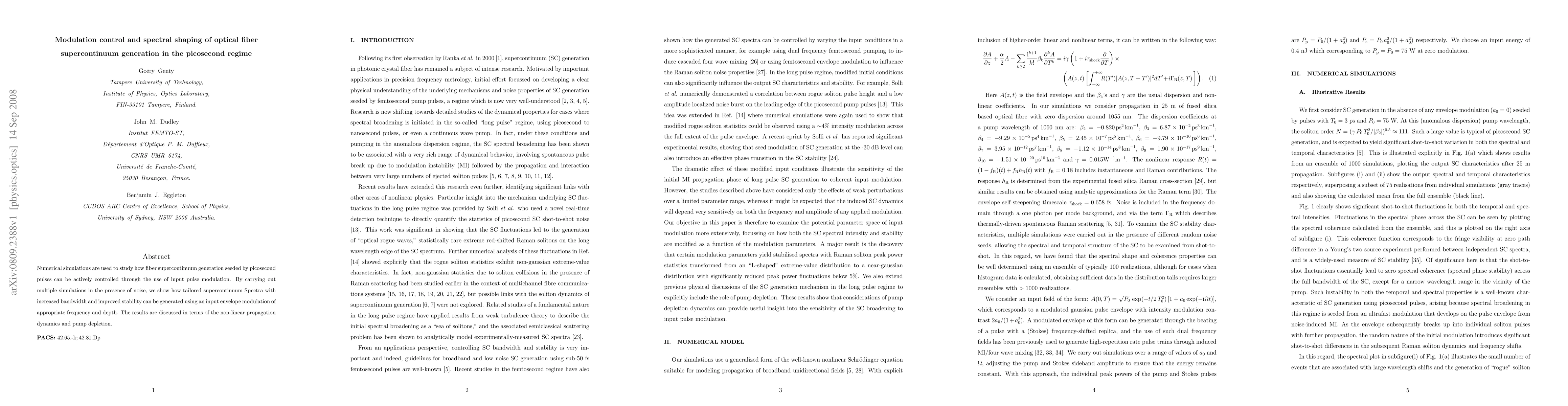 This paper investigates the active control of optical fiber supercontinuum generation using picosecond pulses through modulation of input pulse envelopes. Numerical simulations demonstrate that tailored supercontinua with enhanced bandwidth and stability can be achieved by adjusting modulation frequency and depth, highlighting the role of non-linear dynamics and pump depletion.