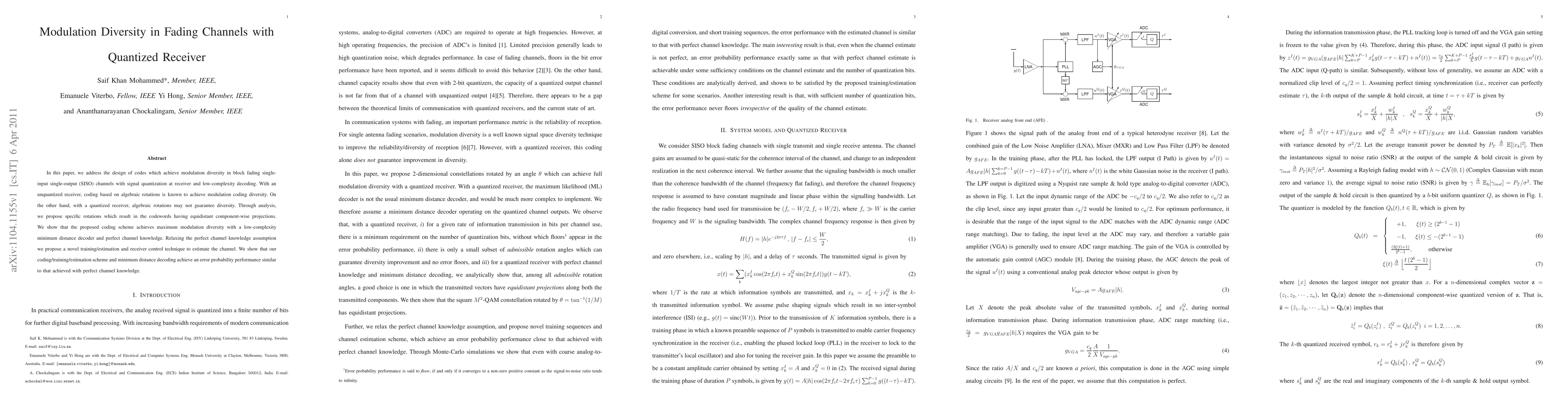 This paper proposes a coding scheme for modulation diversity in fading channels with receiver quantization, achieving maximum diversity through specific algebraic rotations. It also introduces a training/estimation technique to approximate channel knowledge, maintaining similar error performance to perfect channel knowledge.