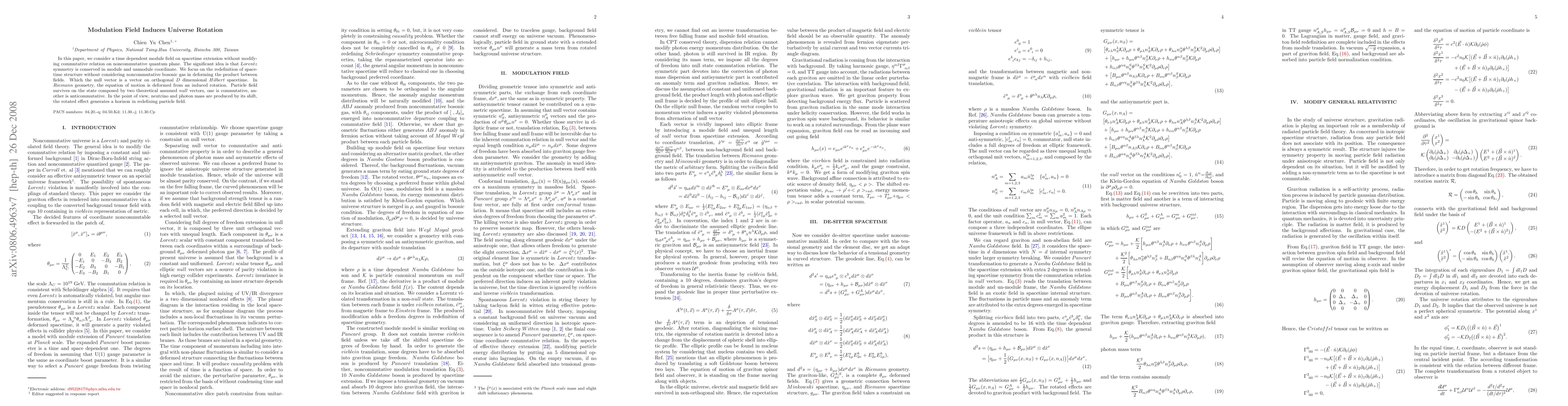 In this paper, we consider a time dependent module field on spacetime extension without modifying commutative relation on noncommutative quantum plane. The significant idea is that $Lorentz$ symmetry is conserved in module and unmodule coordinate. We focus on the redefinition of spacetime structure without considering noncommutative bosonic gas in deforming the product between fields. Which the null vector is a vector on orthogonal $D$ dimensional $Hilbert$ spacetime. In $Riemann$ geometry, the equation of motion is deformed from an induced rotation. Particle field survives on the state composed by two theoretical assumed $null$ vectors, one is commutative, another is anticommutative. In the point of view, neutrino and photon mass are produced by its shift, the rotated effect generates a horizon in redefining particle field.