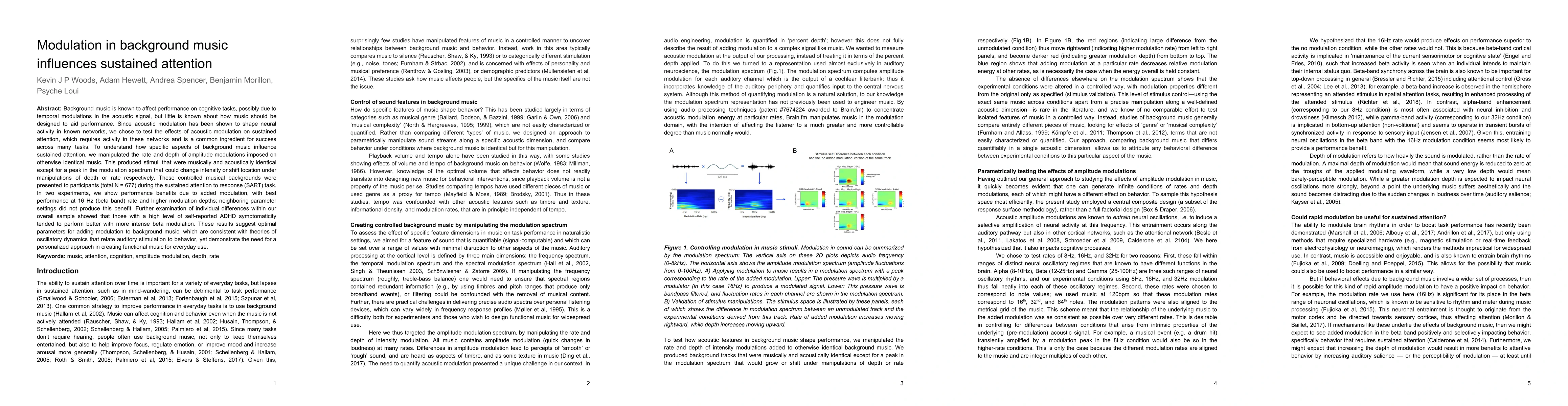 This study investigates how modulation in background music affects sustained attention, finding that optimal performance occurs with 16 Hz modulation at higher depths. Individuals with higher ADHD symptoms benefit more from intense beta modulation, suggesting personalized music design for cognitive enhancement.