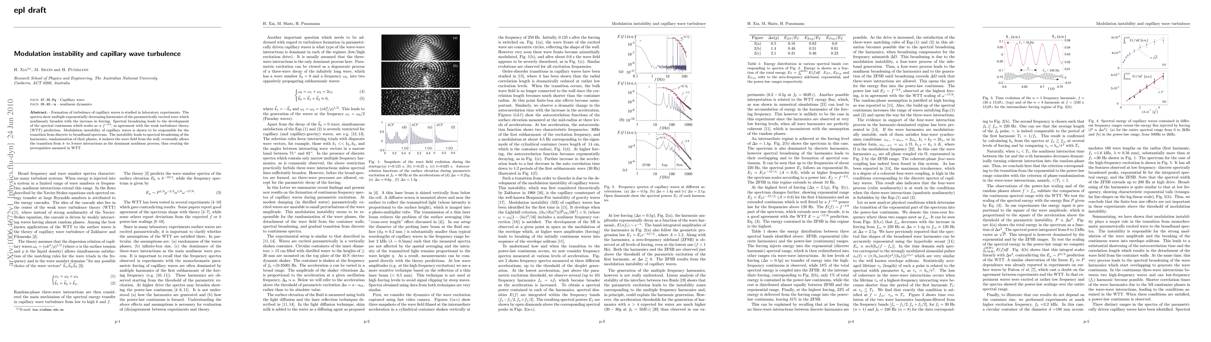 This paper investigates the turbulence of capillary waves in laboratory experiments, revealing that modulation instability drives the transition from discrete to broadband spectral behavior, consistent with weak turbulence theory predictions. The spectral continuum scales as $f^{-2.8}$, indicating the dominance of nonlinear interactions.