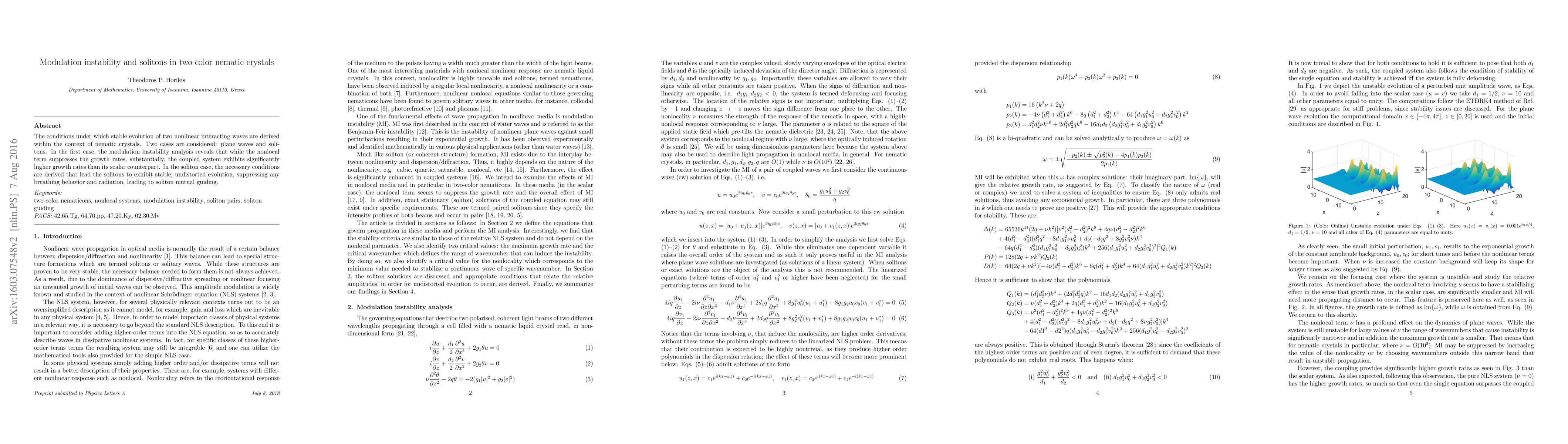 The conditions under which stable evolution of two nonlinear interacting waves are derived within the context of nematic crystals. Two cases are considered: plane waves and solitons. In the first case, the modulation instability analysis reveals that while the nonlocal term suppresses the growth rates, substantially, the coupled system exhibits significantly higher growth rates than its scalar counterpart. In the soliton case, the necessary conditions are derived that lead the solitons to exhibit stable, undistorted evolution, suppressing any breathing behavior and radiation, leading to soliton mutual guiding.