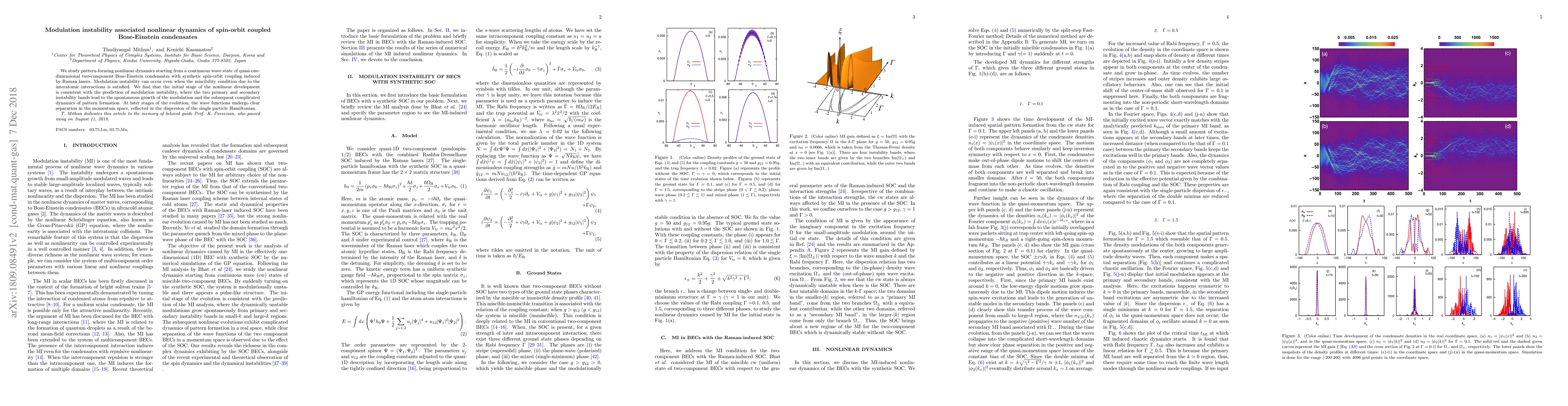 This paper investigates the nonlinear dynamics of spin-orbit coupled Bose-Einstein condensates, revealing modulation instability leading to pattern formation. The study finds that even under miscibility conditions, modulation instability drives the growth of modulations and complex dynamics, with wave functions separating in momentum space.