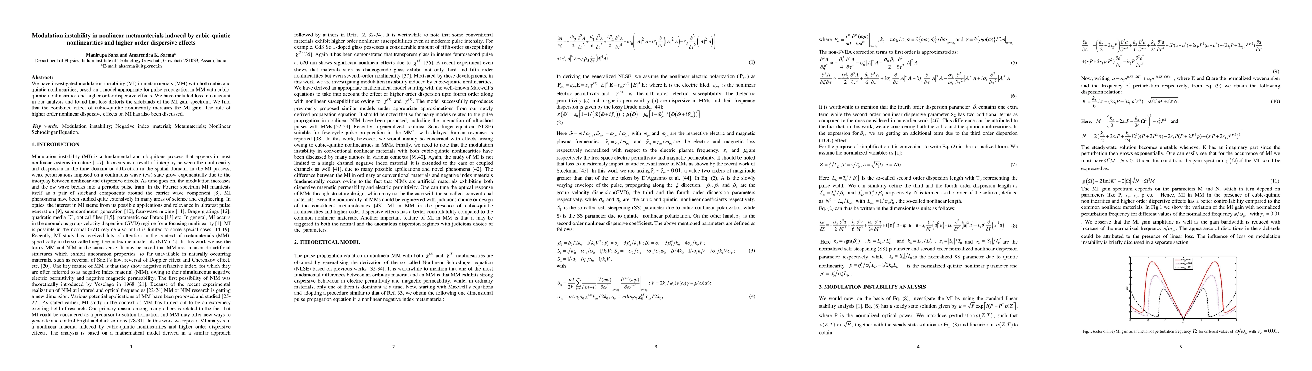 This paper investigates modulation instability in nonlinear metamaterials with cubic-quintic nonlinearities and higher order dispersive effects, finding that loss distorts MI gain sidebands and that combined cubic-quintic nonlinearity enhances MI gain. The study also discusses the impact of higher order dispersive effects on modulation instability.