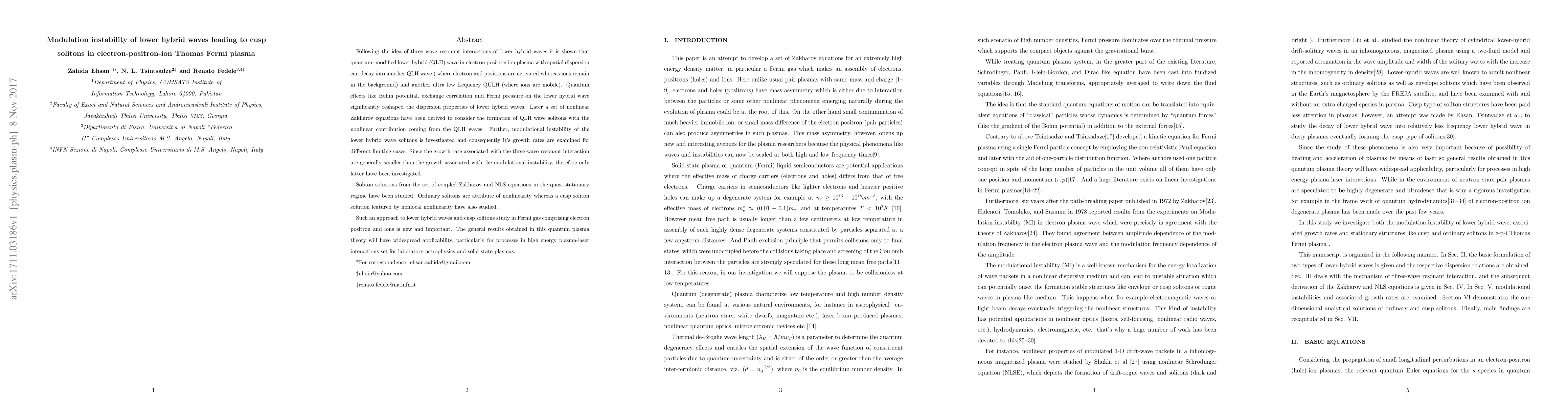 Following the idea of three wave resonant interactions of lower hybrid waves it is shown that quantum -modified lower hybrid (QLH) wave in electron positron ion plasma with spatial dispersion can decay into another QLH wave ( where electron and positrons are activated whereas ions remain in the background) and another ultra low frequency QULH (where ions are mobile). Quantum effects like Bohm potential, exchange correlation and Fermi pressure on the lower hybrid wave significantly reshaped the dispersion properties of lower hybrid waves. Later a set of nonlinear Zakharov equations have been derived to consider the formation of QLH wave solitons with the nonlinear contribution coming from the QLH waves. Further, modulational instability of the lower hybrid wave solitons is investigated and consequently it's growth rates are examined for different limiting cases. Since the growth rate associated with the three-wave resonant interaction are generally smaller than the growth associated with the modulational instability, therefore only latter have been investigated. Soliton solutions from the set of coupled Zakharov and NLS equations in the quasi-stationary regime have been studied. Ordinary solitons are attribute of nonlinearity whereas a cusp soliton solution featured by nonlocal nonlinearity have also studied. Such an approach to lower hybrid waves and cusp solitons study in Fermi gas comprising electron positron and ions is new and important. The general results obtained in this quantum plasma theory will have widespread applicability, particularly for processes in high energy plasma-laser interactions set for laboratory astrophysics and solid state plasmas.