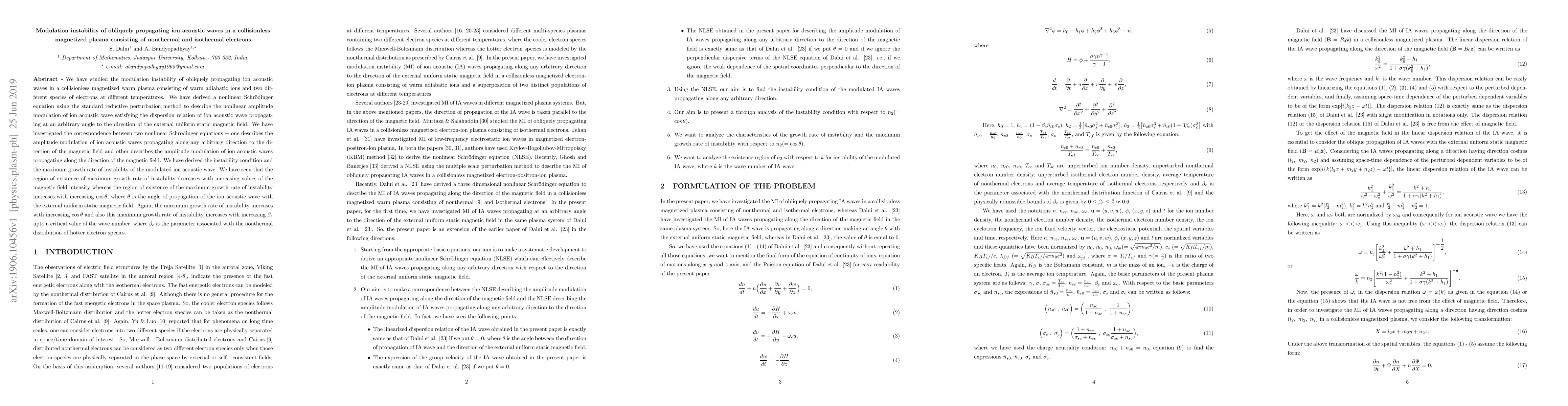 This paper investigates the modulation instability of obliquely propagating ion acoustic waves in a magnetized plasma with nonthermal and isothermal electrons. It derives a nonlinear Schrödinger equation to describe the wave's amplitude modulation and finds that the instability's maximum growth rate increases with the cosine of the wave's propagation angle relative to the magnetic field, but decreases with stronger magnetic fields.