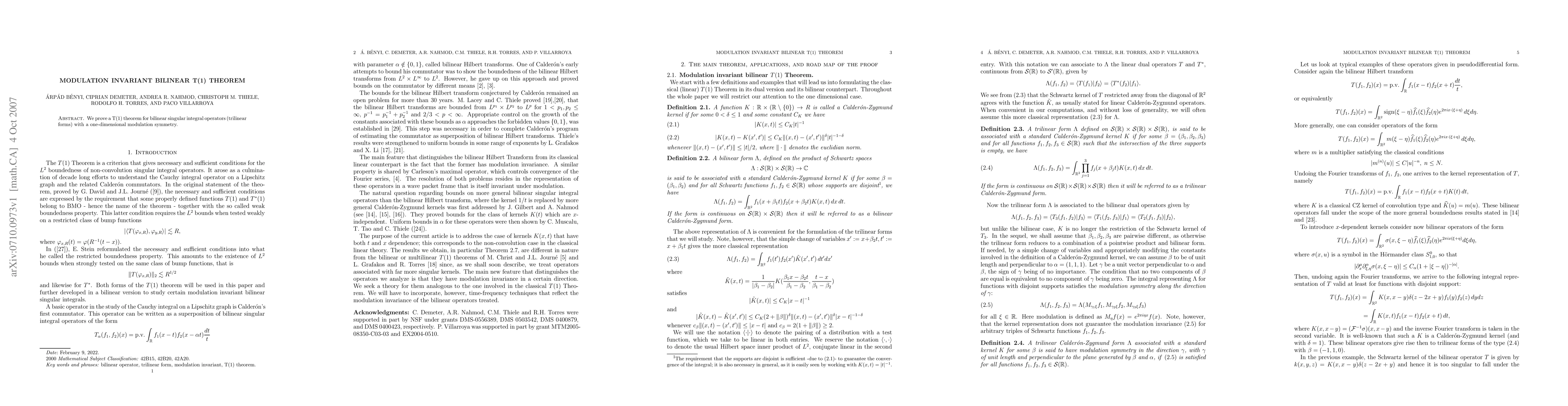 The paper establishes a T(1) theorem for bilinear singular integral operators possessing one-dimensional modulation symmetry, enhancing our understanding of such trilinear forms. This result contributes to the field by providing a robust framework for analyzing these operators.