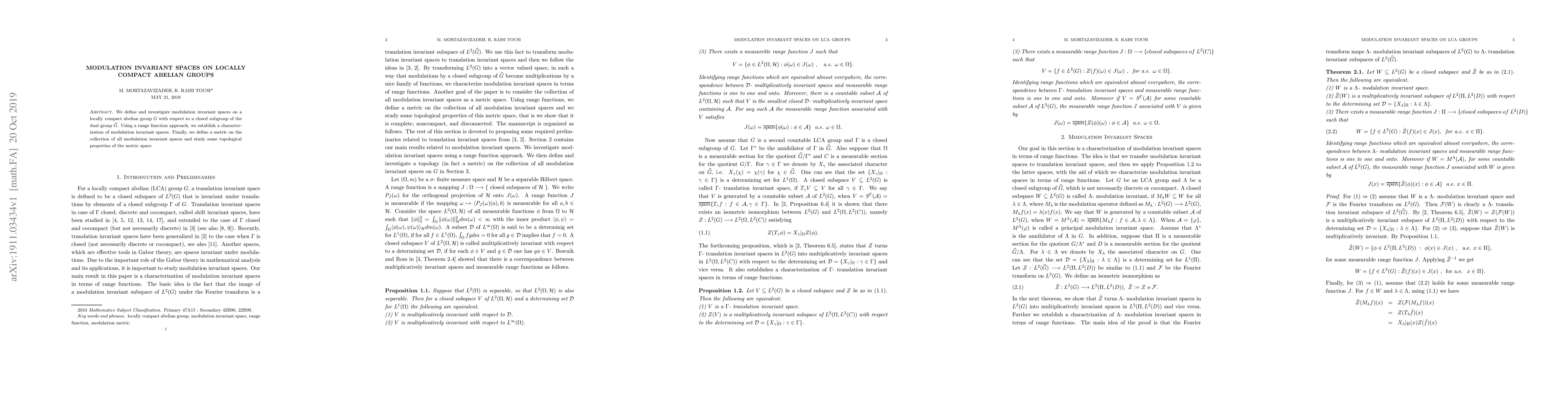 This paper defines modulation invariant spaces on locally compact abelian groups relative to a subgroup of the dual group, characterizes them using a range function, and explores topological properties of the metric space formed by these spaces.