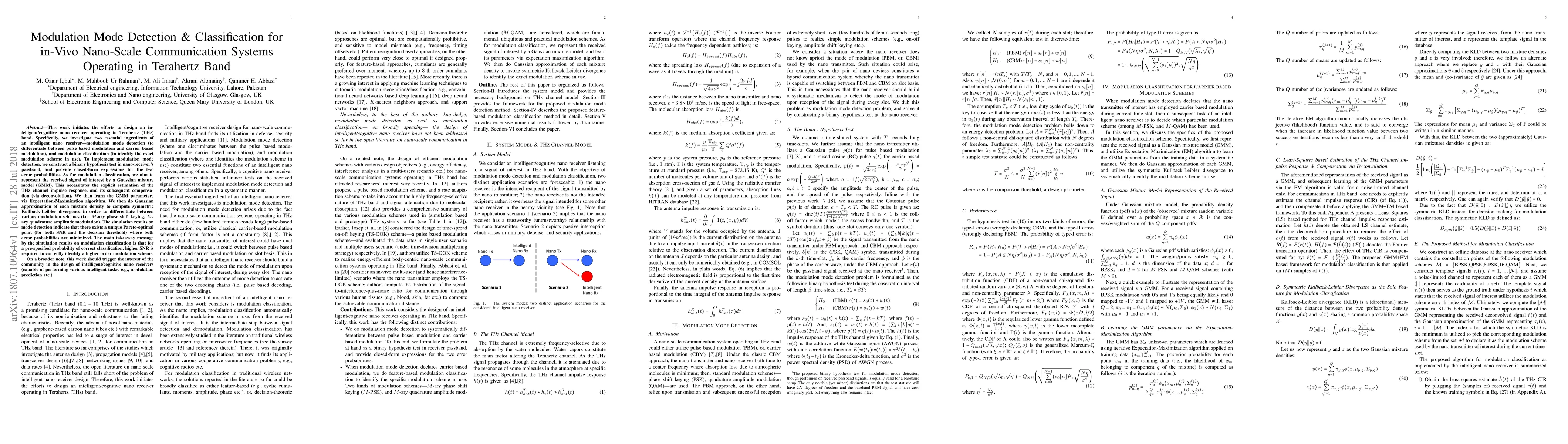 This research introduces an intelligent nano-receiver for Terahertz band communication, focusing on modulation mode detection and classification. It presents a binary hypothesis test for detection, closed-form error probability expressions, and a Gaussian mixture model for classification, using Expectation-Maximization algorithm. Simulations show a Pareto-optimal point for detection and increased SNR requirement for higher modulation order classification in nano receivers.