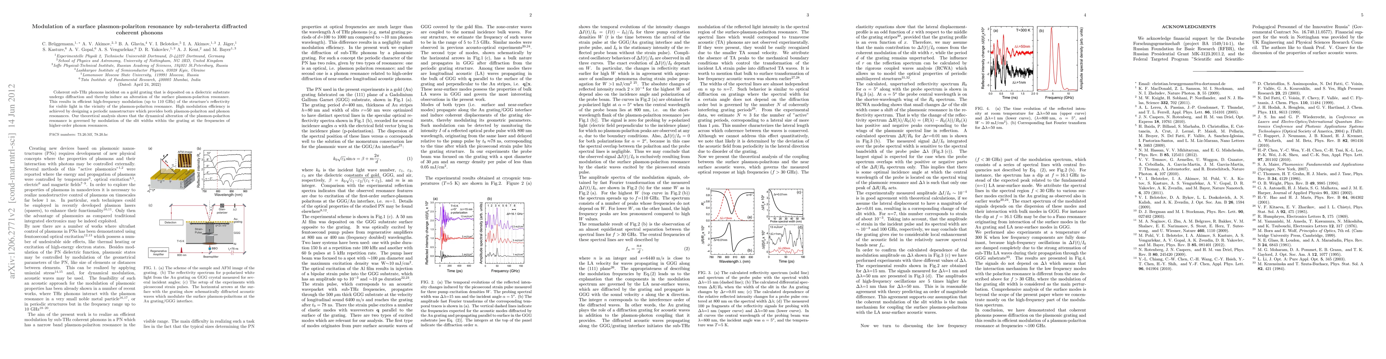 This paper investigates how coherent sub-terahertz phonons diffracted by a gold grating modulate the surface plasmon-polariton resonance, achieving high-frequency modulation (up to 110 GHz) of the structure's reflectivity for visible light. The design of a periodic nanostructure with both plasmon-polariton and phonon resonances enhances modulation efficiency.