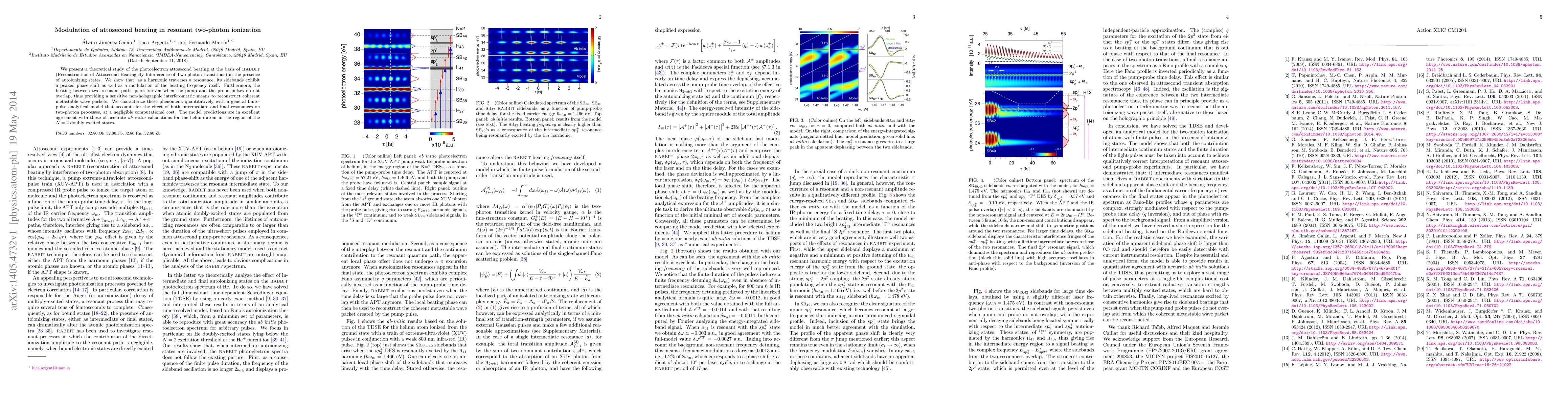 We present a theoretical study of the photoelectron attosecond beating at the basis of RABBIT (Reconstruction of Attosecond Beating By Interference of Two-photon transitions) in the presence of autoionizing states. We show that, as a harmonic traverses a resonance, its sidebands exhibit a peaked phase shift as well as a modulation of the beating frequency itself. Furthermore, the beating between two resonant paths persists even when the pump and the probe pulses do not overlap, thus providing a sensitive non-holographic interferometric means to reconstruct coherent metastable wave packets. We characterize these phenomena quantitatively with a general finite-pulse analytical model that accounts for the effect of both intermediate and final resonances on two-photon processes, at a negligible computational cost. The model predictions are in excellent agreement with those of accurate ab initio calculations for the helium atom in the region of the N=2 doubly excited states.
