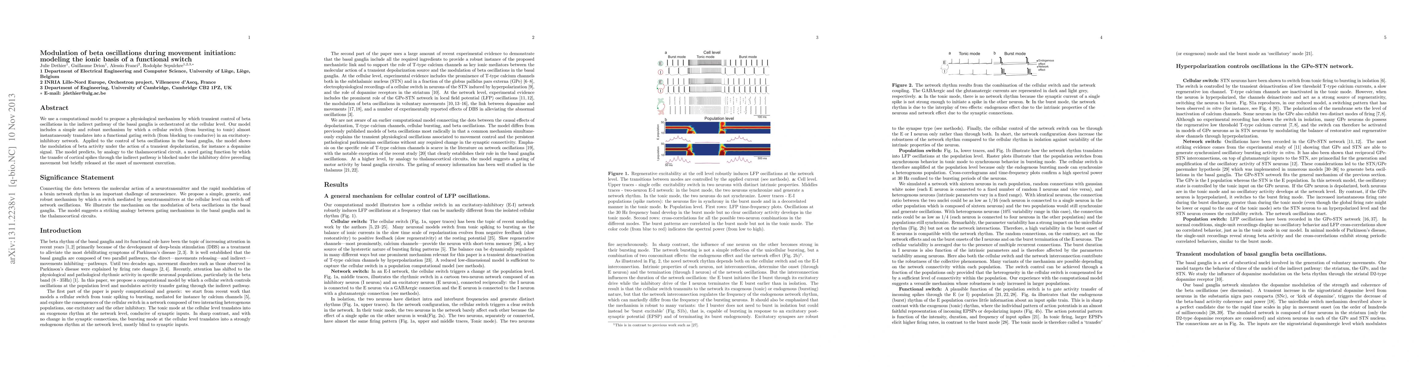 We use a computational model to propose a physiological mechanism by which transient control of beta oscillations in the indirect pathway of the basal ganglia is orchestrated at the cellular level. Our model includes a simple and robust mechanism by which a cellular switch (from bursting to tonic) almost instantaneously translates into a functional gating switch (from blocking to conducive) in an excitatory-inhibitory network. Applied to the control of beta oscillations in the basal ganglia, the model shows the modulation of beta activity under the action of a transient depolarization, for instance a dopamine signal. The model predicts, by analogy to the thalamocortical circuit, a novel gating function by which the transfer of cortical spikes through the indirect pathway is blocked under the inhibitory drive preceding movement but briefly released at the onset of movement execution.