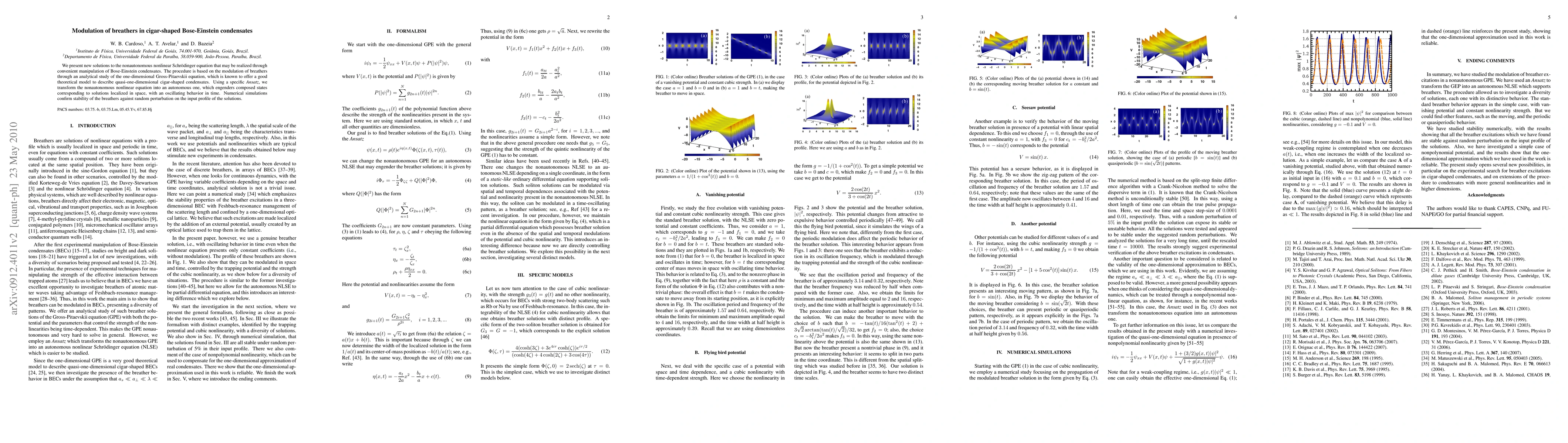 This paper explores new analytical solutions to the nonautonomous nonlinear Schrödinger equation for cigar-shaped Bose-Einstein condensates, transforming it into an autonomous form to generate localized breather states. Numerical simulations validate the stability of the breathers against perturbations.