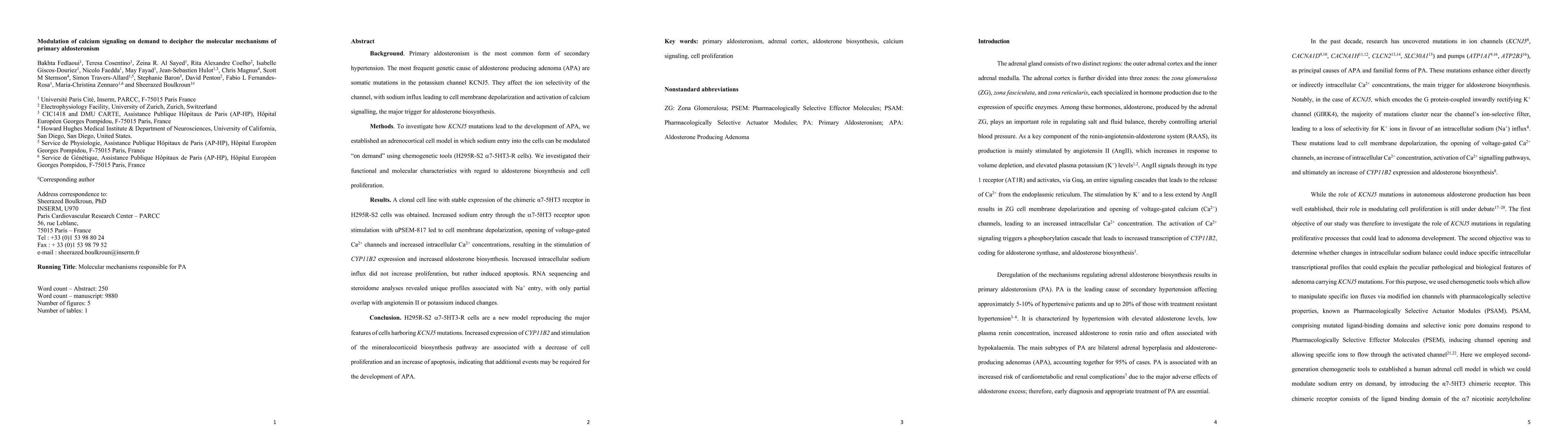 BACKGROUND: Primary aldosteronism is the most common form of secondary hypertension. The most frequent genetic cause of aldosterone-producing adenomas is somatic mutations in the potassium channel KCNJ5. They affect the ion selectivity of the channel, with sodium influx leading to cell membrane depolarization and activation of calcium signaling, the major trigger for aldosterone biosynthesis. METHODS: To investigate how KCNJ5 mutations lead to the development of aldosterone-producing adenomas, we established an adrenocortical cell model in which sodium entry into the cells can be modulated on demand using chemogenetic tools [H295R-S2 $\alpha$7-5HT3-R ($\alpha$7-5HT3 receptor) cells]. We investigated their functional and molecular characteristics with regard to aldosterone biosynthesis and cell proliferation. RESULTS: A clonal cell line with stable expression of the chimeric $\alpha$7-5HT3-R in H295R-S2 (human adrenocortical carcinoma cell line, Strain 2) cells was obtained. Increased sodium entry through $\alpha$7-5HT3-R upon stimulation with uPSEM-817 (uPharmacologically Selective Effector Molecule-817) led to cell membrane depolarization, opening of voltage-gated Ca 2+ channels, and increased intracellular Ca 2+ concentrations, resulting in the stimulation of CYP11B2 expression and increased aldosterone biosynthesis. Increased intracellular sodium influx did not increase proliferation but rather induced apoptosis. RNA sequencing and steroidome analyses revealed unique profiles associated with Na + entry, with only partial overlap with Ang II (angiotensin II) or potassium-induced changes. CONCLUSIONS: H295R-S2 $\alpha$7-5HT3-R cells are a new model reproducing the major features of cells harboring KCNJ5 mutations. Increased expression of CYP11B2 and stimulation of the mineralocorticoid biosynthesis pathway are associated with a decrease of cell proliferation and an increase of apoptosis, indicating that additional events may be required for the development of aldosterone-producing adenomas.