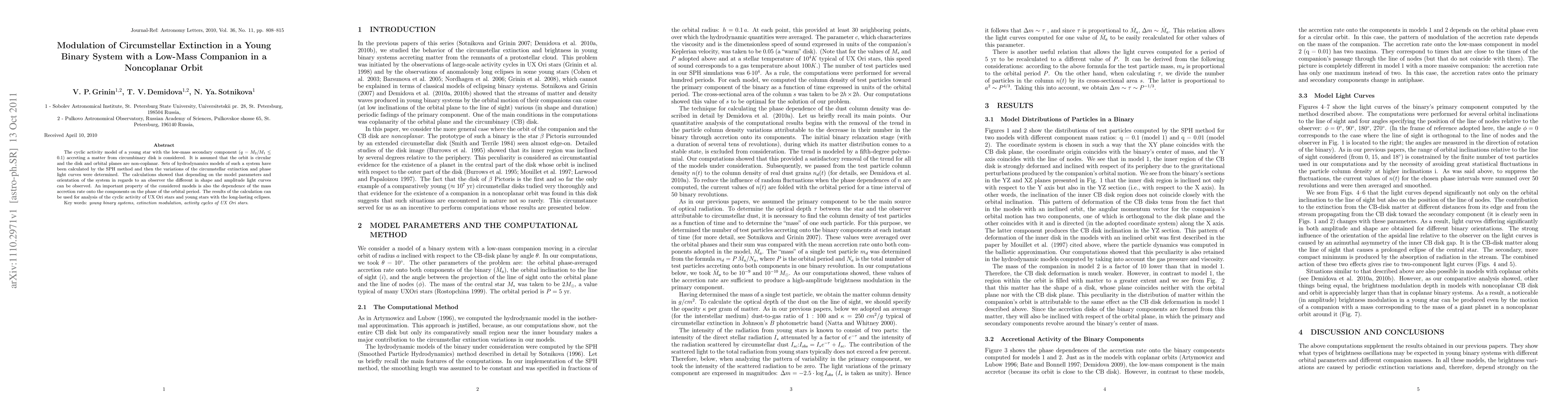 The cyclic activity model of a young star with the low-mass secondary component (q = M2/M1 <= 0.1) accreting a matter from circumbinary disk is considered. It is assumed that the orbit is circular and the disk and orbital planes are non-coplanar. Sets of hydrodynamics models of such a system have been calculated by the SPH method and then the variations of the circumstellar extinction and phase light curves were determined. The calculations showed that depending on the model parameters and orientation of the system in regards to an observer the different in shape and amplitude light curves can be observed. An important property of the considered models is also the dependence of the mass accretion rate onto the components on the phase of the orbital period. The results of the calculation can be used for analysis of the cyclic activity of UX Ori stars and young stars with the long-lasting eclipses.