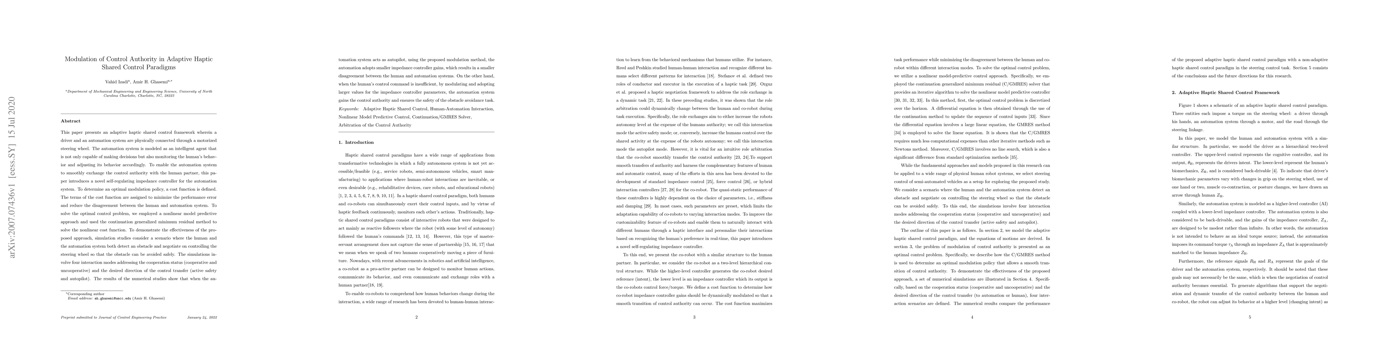 This paper presents an adaptive haptic shared control framework wherein a driver and an automation system are physically connected through a motorized steering wheel. The automation system is modeled as an intelligent agent that is not only capable of making decisions but also monitoring the human's behavior and adjusting its behavior accordingly. To enable the automation system to smoothly exchange the control authority with the human partner, this paper introduces a novel self-regulating impedance controller for the automation system. To determine an optimal modulation policy, a cost function is defined. The terms of the cost function are assigned to minimize the performance error and reduce the disagreement between the human and automation system. To solve the optimal control problem, we employed a nonlinear model predictive approach and used the continuation generalized minimum residual method to solve the nonlinear cost function. To demonstrate the effectiveness of the proposed approach, simulation studies consider a scenario where the human and the automation system both detect an obstacle and negotiate on controlling the steering wheel so that the obstacle can be avoided safely. The simulations involve four interaction modes addressing the cooperation status (cooperative and uncooperative) and the desired direction of the control transfer (active safety and autopilot).
