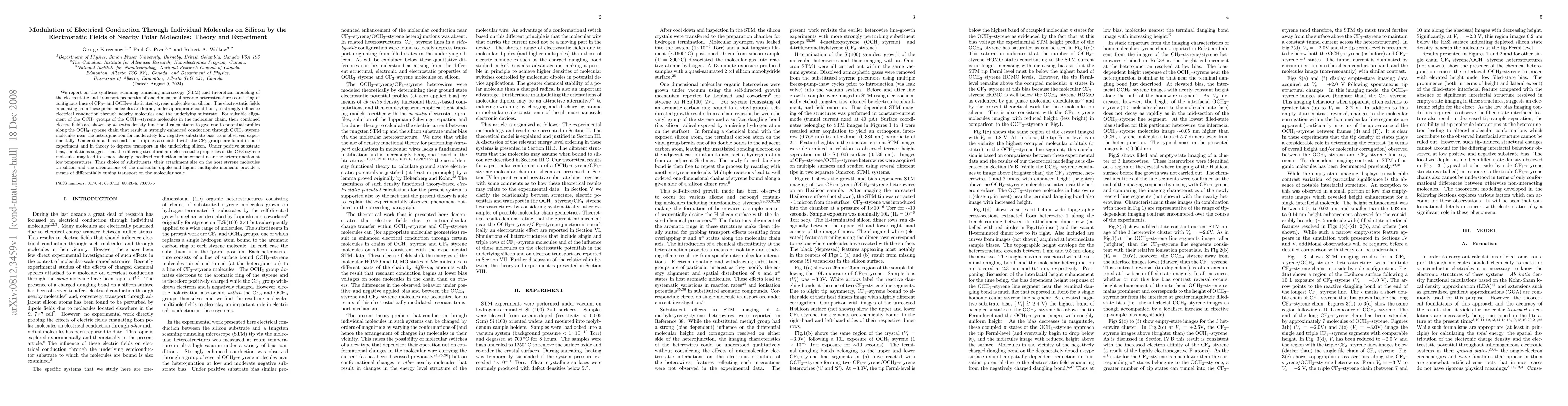 This paper explores the modulation of electrical conduction through individual CF3- and OCH3-substituted styrene molecules on silicon via electrostatic fields from nearby polar molecules. Theoretical and experimental results show that the combined electric fields from aligned OCH3 groups enhance conduction under low negative bias, while CF3 groups suppress transport in silicon, with potential for tuning transport at low temperatures.