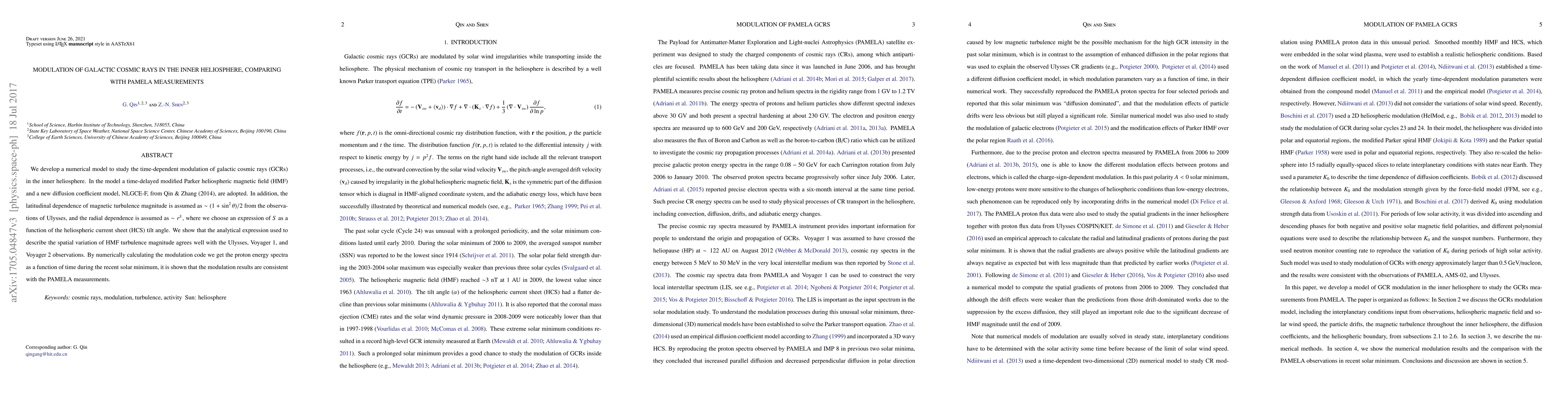 This paper develops a numerical model to study the time-dependent modulation of galactic cosmic rays in the inner heliosphere, using a modified Parker heliospheric magnetic field and a new diffusion coefficient model. The model's results are consistent with PAMELA measurements and agree well with observations from Ulysses, Voyager 1, and Voyager 2.