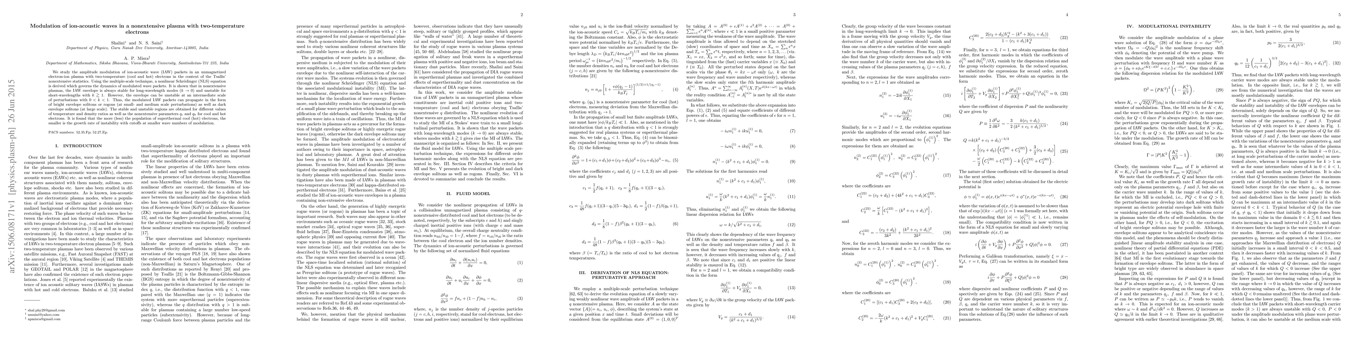 This paper investigates the modulation of ion-acoustic waves in nonextensive plasmas with two-temperature electron populations, deriving a nonlinear Schrödinger equation. It finds that wave envelopes are stable for long wavelengths but unstable for short wavelengths, with solitons and rogons forming under certain conditions.