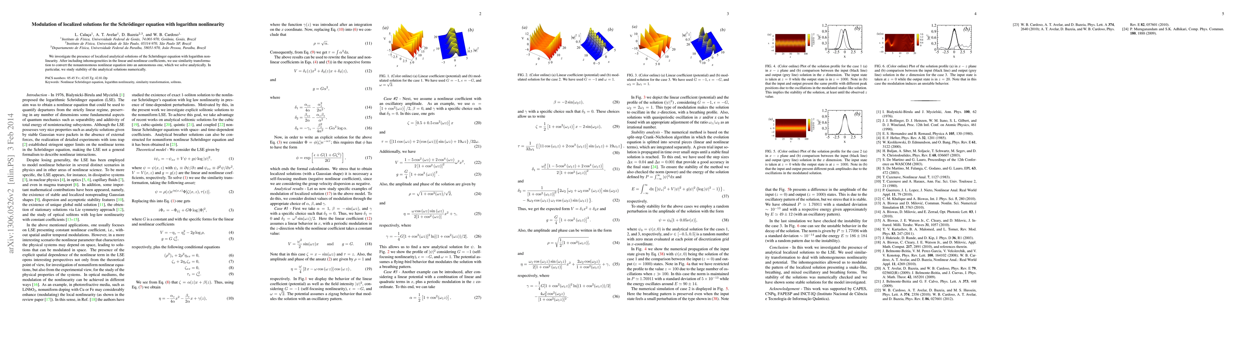 We investigate the presence of localized analytical solutions of the Schr\"odinger equation with logarithm nonlinearity. After including inhomogeneities in the linear and nonlinear coefficients, we use similarity transformation to convert the nonautonomous nonlinear equation into an autonomous one, which we solve analytically. In particular, we study stability of the analytical solutions numerically.