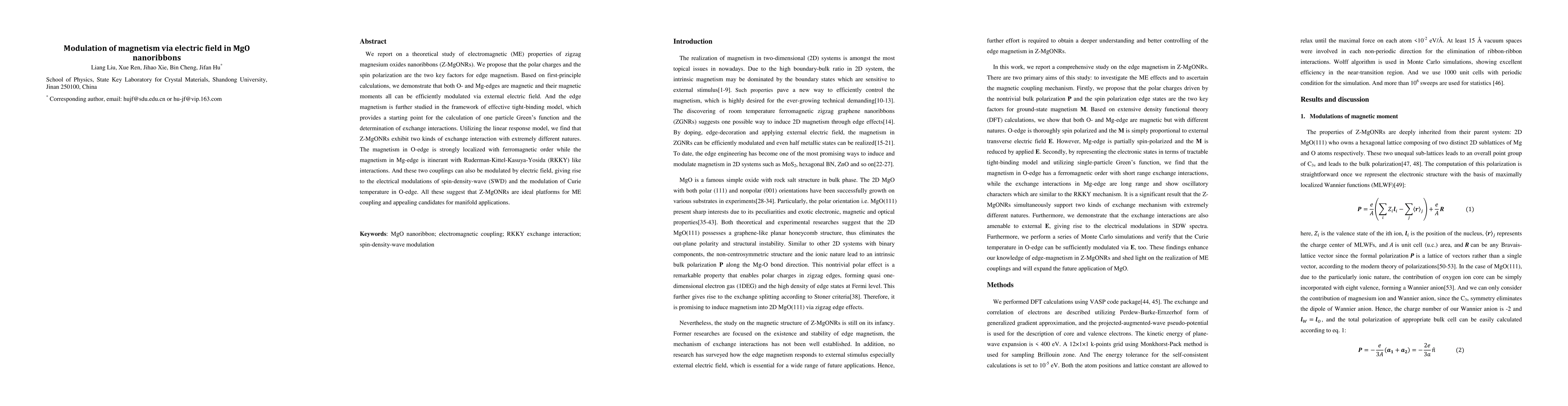 We report on a theoretical study of electromagnetic properties of zigzag magnesium oxides nanoribbons (Z-MgONRs). We propose that the polar charges and the spin polarization are the two key factors for edge magnetism. Based on first-principle calculations, we demonstrate that both O- and Mg-edges are magnetic and their magnetic moments all can be efficiently modulated via external electric field.And the edge magnetism is further studied in the framework of effective tight-binding model, which provides a starting point for the calculation of one particle Green's function and the determination of exchange interactions. Utilizing the linear response model, we find that Z-MgONRs exhibit two kinds of exchange interaction with extremely different natures. The magnetism in O-edge is strongly localized with ferromagnetic order while the magnetism in Mg-edge is itinerant with Ruderman-Kittel-Kasuya-Yosida (RKKY) like interactions. And these two couplings can also be modulated by electric field, giving rise to the electrical modulations of spin-density-wave (SDW) and the modulation of Curie temperature in O-edge. All these suggest that Z-MgONRs are ideal platforms for ME coupling and appealing candidates for manifold applications.