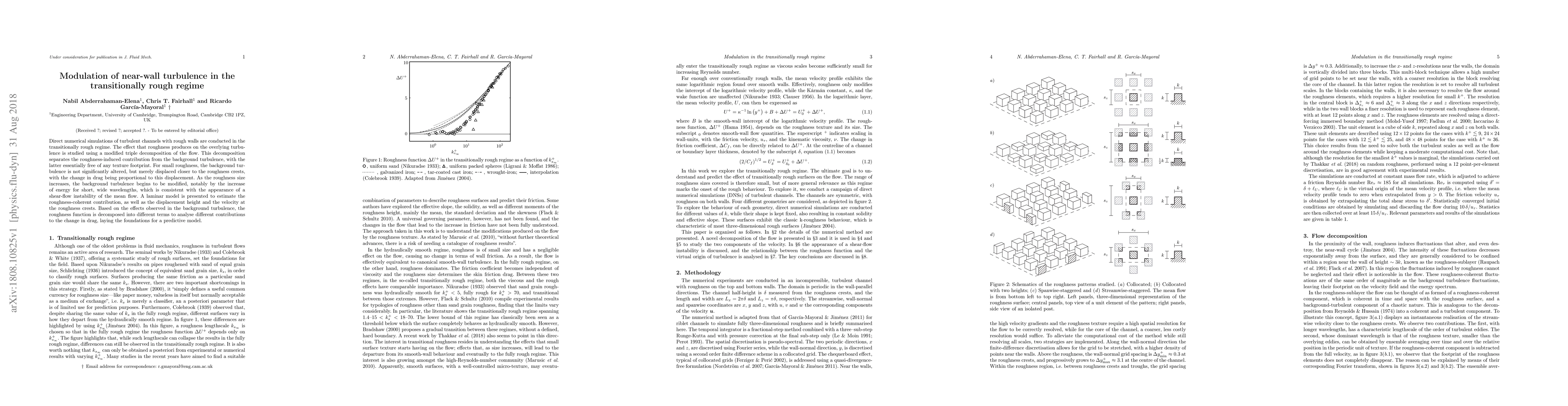 Direct numerical simulations of turbulent channels with rough walls are conducted in the transitionally rough regime. The effect that roughness produces on the overlying turbulence is studied using a modified triple decomposition of the flow. This decomposition separates the roughness-induced contribution from the background turbulence, with the latter essentially free of any texture footprint. For small roughness, the background turbulence is not significantly altered, but merely displaced closer to the roughness crests, with the change in drag being proportional to this displacement. As the roughness size increases, the background turbulence begins to be modified, notably by the increase of energy for short, wide wavelengths, which is consistent with the appearance of a shear-flow instability of the mean flow. A laminar model is presented to estimate the roughness-coherent contribution, as well as the displacement height and the velocity at the roughness crests. Based on the effects observed in the background turbulence, the roughness function is decomposed into different terms to analyse different contributions to the change in drag, laying the foundations for a predictive model.