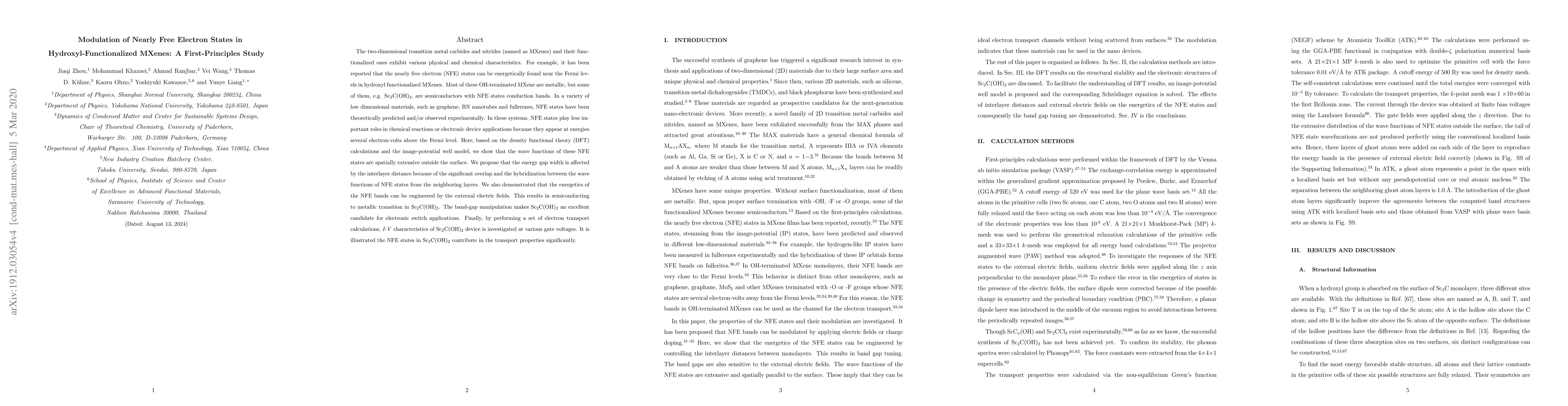 This study uses density functional theory to investigate nearly free electron states in hydroxyl-functionalized MXenes, revealing that their metallic or semiconducting properties depend on interlayer distances and external electric fields. The findings suggest potential for electronic switch applications due to tunable band gaps.