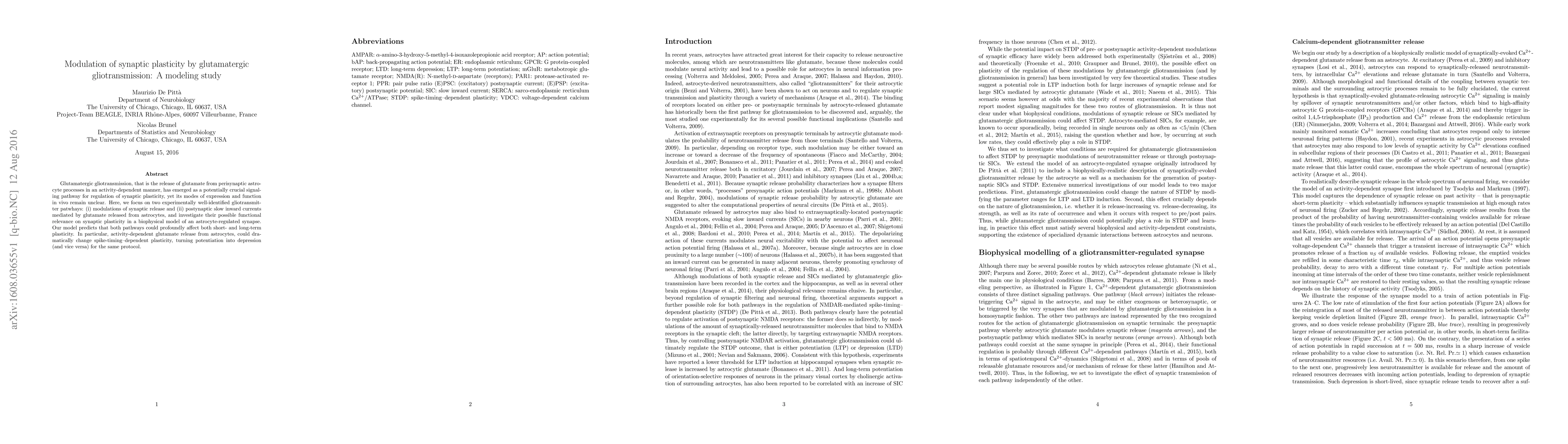 This study models the impact of glutamatergic gliotransmission from astrocytes on synaptic plasticity, focusing on two pathways: modulation of synaptic release and postynaptic slow inward currents. The findings suggest these pathways can significantly influence both short-term and long-term synaptic plasticity, potentially reversing spike-timing-dependent plasticity protocols.