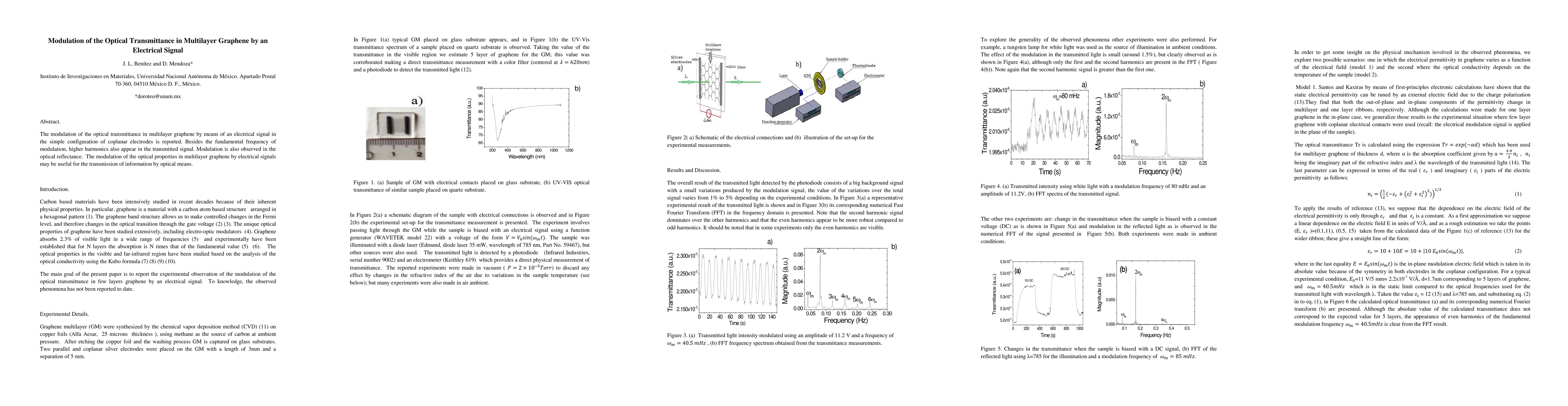 Summary: This paper reports the modulation of optical transmittance and reflectance in multilayer graphene via electrical signals, revealing the presence of fundamental and higher harmonics, with potential applications in optical information transmission.