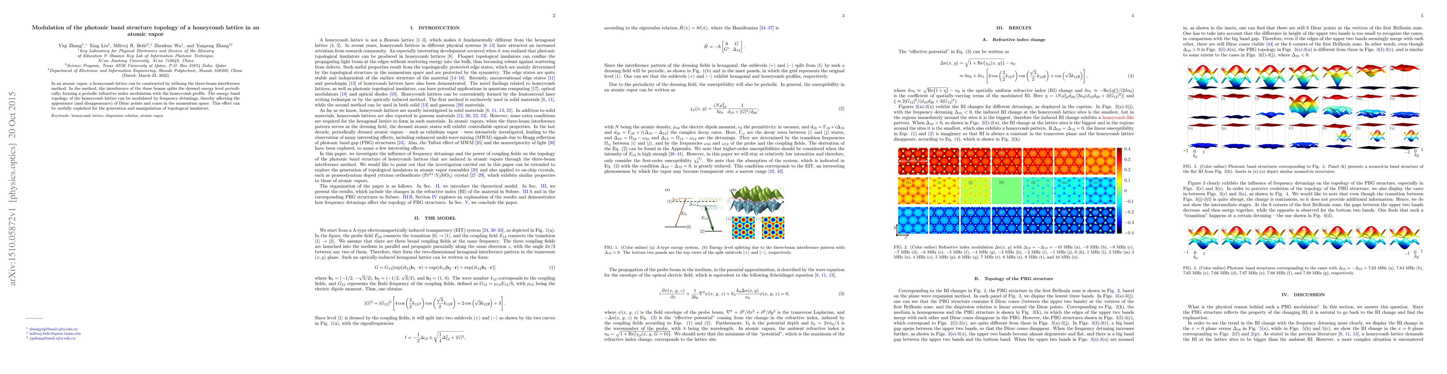 This research constructs a photonic honeycomb lattice in an atomic vapor using three-beam interference, which modulates the photonic band structure topology by altering frequency detunings. The method enables the creation and manipulation of topological insulators by controlling the appearance of Dirac points and cones.