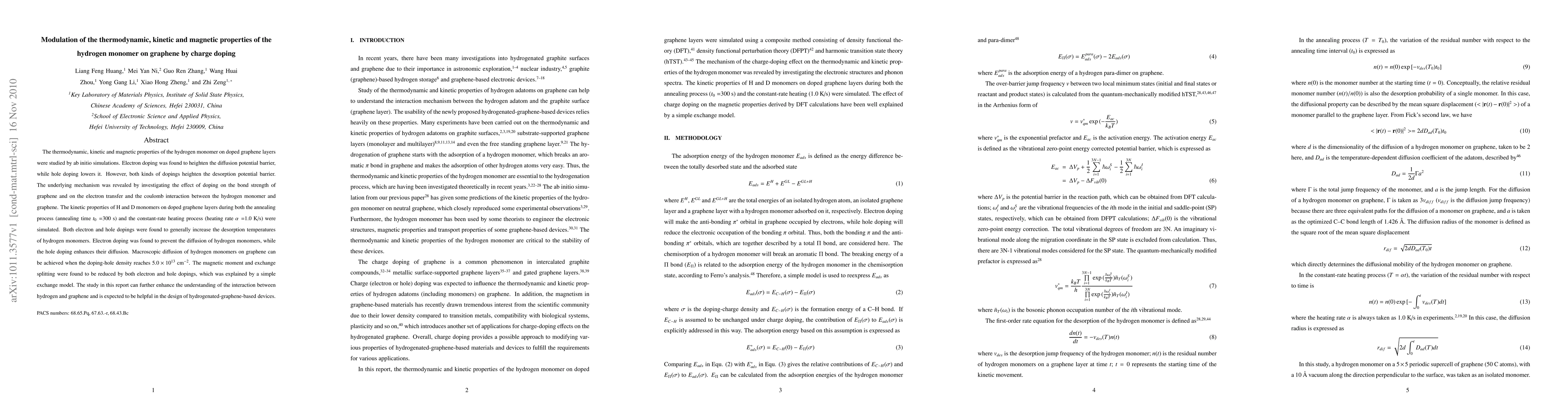 The thermodynamic, kinetic and magnetic properties of the hydrogen monomer on doped graphene layers were studied by ab initio simulations. Electron doping was found to heighten the diffusion potential barrier, while hole doping lowers it. However, both kinds of dopings heighten the desorption potential barrier. The underlying mechanism was revealed by investigating the effect of doping on the bond strength of graphene and on the electron transfer and the coulomb interaction between the hydrogen monomer and graphene. The kinetic properties of H and D monomers on doped graphene layers during both the annealing process (annealing time $t_0 =$300 s) and the constant-rate heating process (heating rate $\alpha =$1.0 K/s) were simulated. Both electron and hole dopings were found to generally increase the desorption temperatures of hydrogen monomers. Electron doping was found to prevent the diffusion of hydrogen monomers, while the hole doping enhances their diffusion. Macroscopic diffusion of hydrogen monomers on graphene can be achieved when the doping-hole density reaches $5.0\times10^{13}$ cm$^{-2}$. The magnetic moment and exchange splitting were found to be reduced by both electron and hole dopings, which was explained by a simple exchange model. The study in this report can further enhance the understanding of the interaction between hydrogen and graphene and is expected to be helpful in the design of hydrogenated-graphene-based devices.