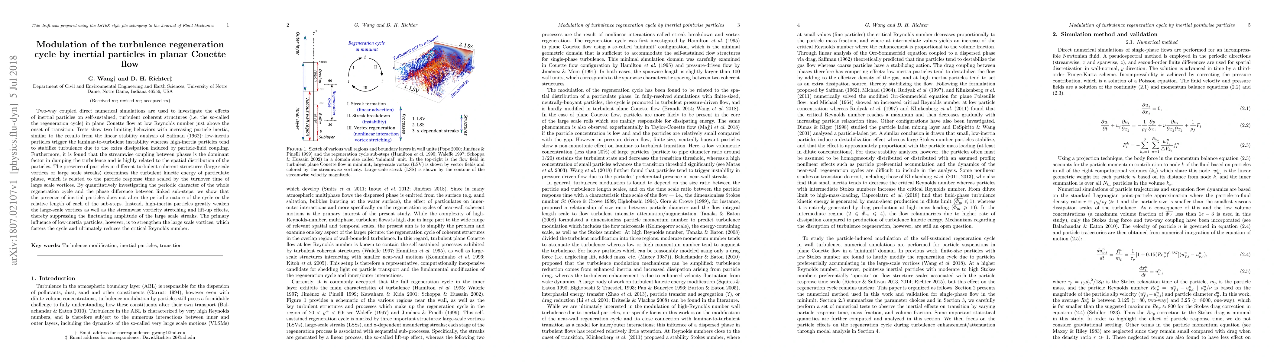 This study uses direct numerical simulations to explore how inertial particles affect the turbulence regeneration cycle in planar Couette flow. It finds that low-inertia particles trigger laminar-to-turbulent instability, while high-inertia particles stabilize turbulence by inducing extra dissipation, primarily through streamwise coupling. The presence of particles influences the turbulent kinetic energy and modifies the fluctuating amplitude of large-scale streaks, but does not alter the periodic nature of the regeneration cycle.