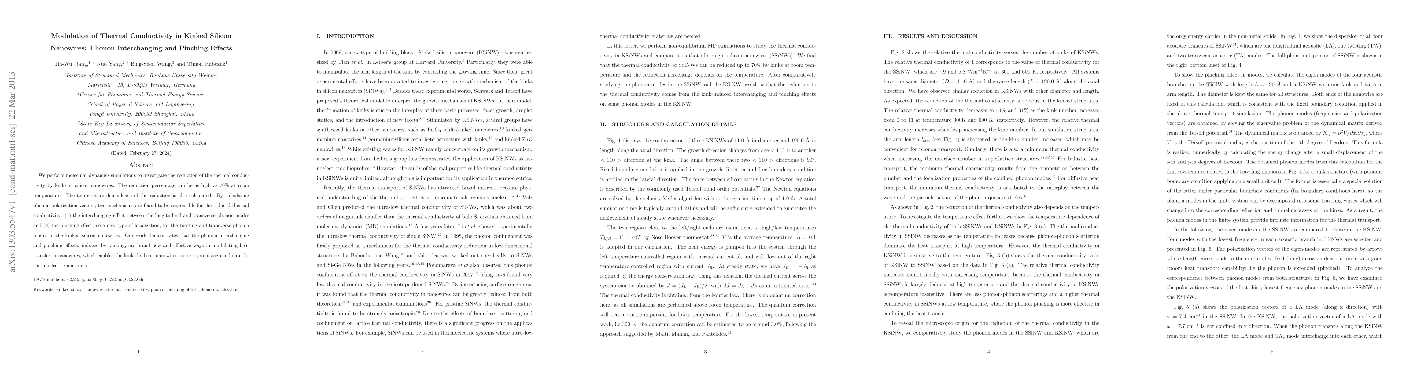 This study uses molecular dynamics simulations to explore how kinks in silicon nanowires reduce thermal conductivity by up to 70% at room temperature. The research identifies two mechanisms: phonon interchanging and a new pinching effect, which significantly modulate heat transfer, making kinked silicon nanowires potential thermoelectric materials.