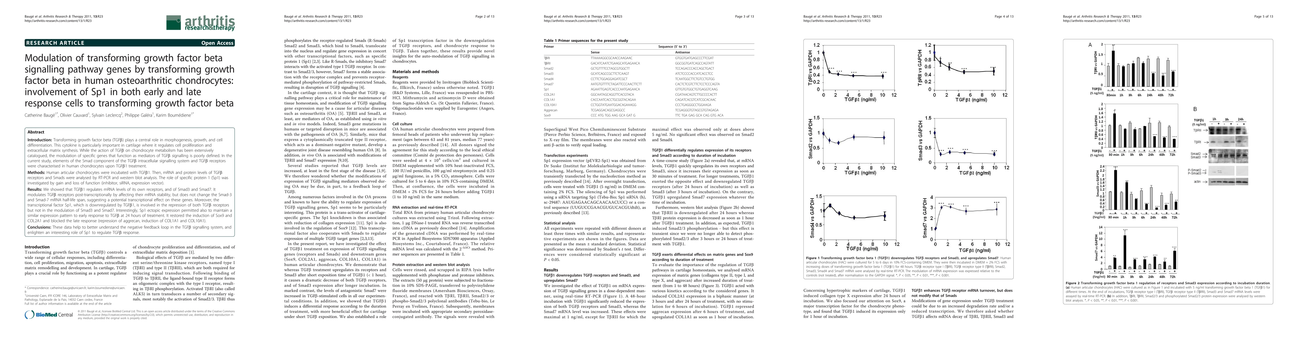 Transforming growth factor beta (TGF$\beta$) plays a central role in morphogenesis, growth, and cell differentiation. This cytokine is particularly important in cartilage where it regulates cell proliferation and extracellular matrix synthesis. While the action of TGF$\beta$ on chondrocyte metabolism has been extensively catalogued, the modulation of specific genes that function as mediators of TGF$\beta$ signalling is poorly defined. In the current study, elements of the Smad component of the TGF$\beta$ intracellular signalling system and TGF$\beta$ receptors were characterised in human chondrocytes upon TGF$\beta$1 treatment. Human articular chondrocytes were incubated with TGF$\beta$1. Then, mRNA and protein levels of TGF$\beta$ receptors and Smads were analysed by RT-PCR and western blot analysis. The role of specific protein 1 (Sp1) was investigated by gain and loss of function (inhibitor, siRNA, expression vector). We showed that TGF$\beta$1 regulates mRNA levels of its own receptors, and of Smad3 and Smad7. It modulates TGF$\beta$ receptors post-transcriptionally by affecting their mRNA stability, but does not change the Smad-3 and Smad-7 mRNA half-life span, suggesting a potential transcriptional effect on these genes. Moreover, the transcriptional factor Sp1, which is downregulated by TGF$\beta$1, is involved in the repression of both TGF$\beta$ receptors but not in the modulation of Smad3 and Smad7. Interestingly, Sp1 ectopic expression permitted also to maintain a similar expression pattern to early response to TGF$\beta$ at 24 hours of treatment. It restored the induction of Sox9 and COL2A1 and blocked the late response (repression of aggrecan, induction of COL1A1 and COL10A1). These data help to better understand the negative feedback loop in the TGF$\beta$ signalling system, and enlighten an interesting role of Sp1 to regulate TGF$\beta$ response.