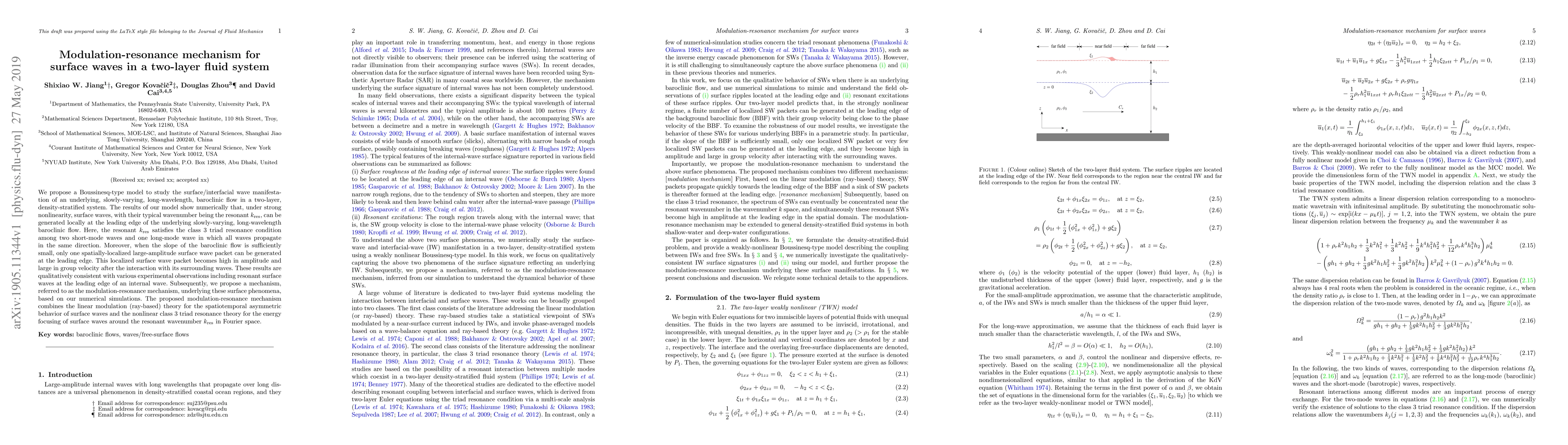 We propose a Boussinesq-type model to study the surface/interfacial wave manifestation of an underlying, slowly-varying, long-wavelength, baroclinic flow in a two-layer, density-stratified system. The results of our model show numerically that, under strong nonlinearity, surface waves, with their typical wavenumber being the resonant $k_{\mathrm{res}}$, can be generated locally at the leading edge of the underlying slowly-varying, long-wavelength baroclinic flow. Here, the resonant $k_{\mathrm{res}}$ satisfies the class 3 triad resonance condition among two short-mode waves and one long-mode wave in which all waves propagate in the same direction. Moreover, when the slope of the baroclinic flow is sufficiently small, only one spatially-localized large-amplitude surface wave packet can be generated at the leading edge. This localized surface wave packet becomes high in amplitude and large in group velocity after the interaction with its surrounding waves. These results are qualitatively consistent with various experimental observations including resonant surface waves at the leading edge of an internal wave. Subsequently, we propose a mechanism, referred to as the modulation-resonance mechanism, underlying these surface phenomena, based on our numerical simulations. The proposed modulation-resonance mechanism combines the linear modulation (ray-based) theory for the spatiotemporal asymmetric behavior of surface waves and the nonlinear class 3 triad resonance theory for the energy focusing of surface waves around the resonant wavenumber $k_{\mathrm{res}}$ in Fourier space.