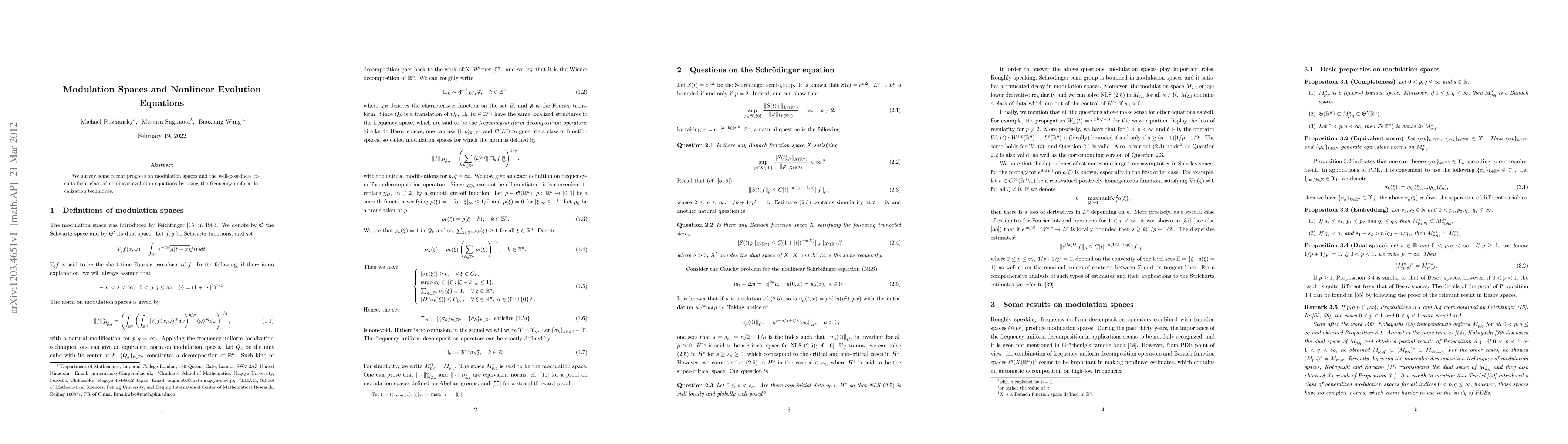 Summary: This paper reviews recent advancements in modulation spaces and establishes well-posedness results for nonlinear evolution equations through frequency-uniform localization techniques. The focus is on the mathematical framework and analytical methods used to address these complex problems.