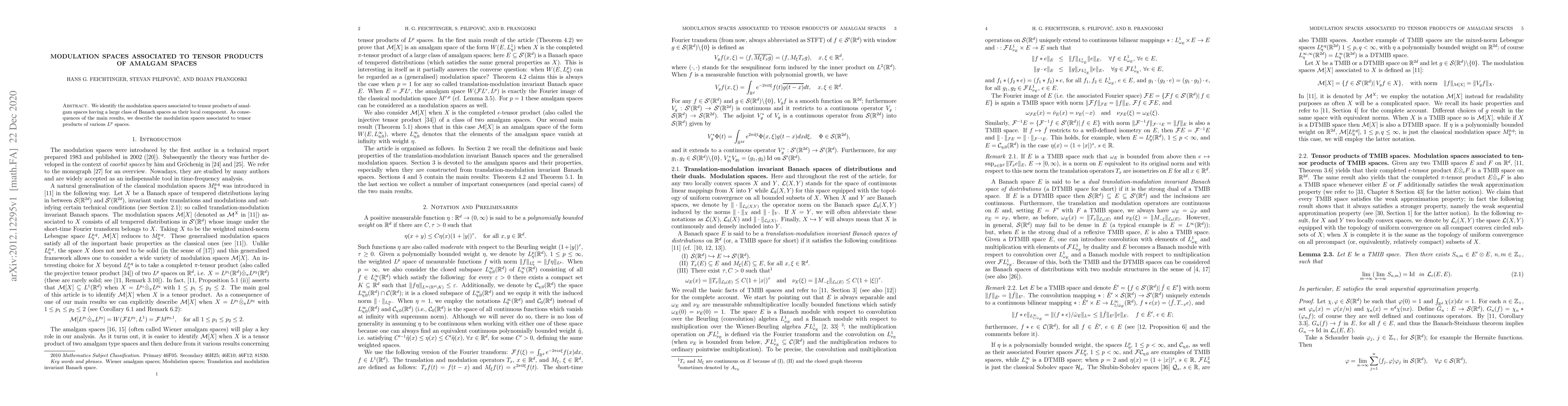 This paper identifies modulation spaces linked to tensor products of amalgam spaces, encompassing a wide range of Banach spaces. It also describes the modulation spaces associated with tensor products of various $L^p$ spaces as a result of the main findings.