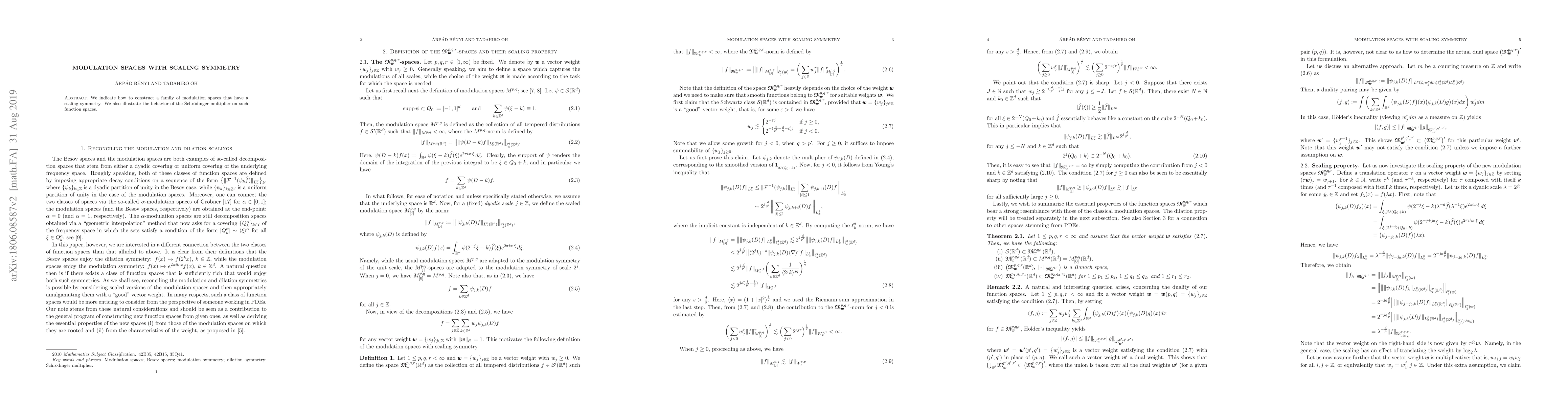 We indicate how to construct a family of modulation function spaces that have a scaling symmetry. We also illustrate the behavior of the Schr\"odinger multiplier on such function spaces.