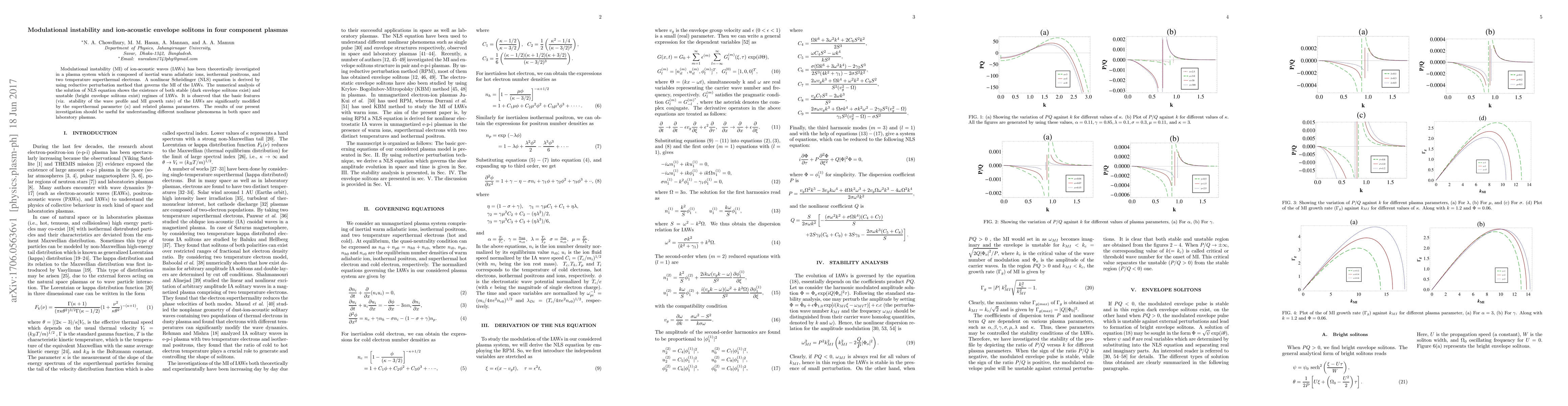 This paper investigates the modulational instability of ion-acoustic waves in a four-component plasma system using a nonlinear Schrödinger equation derived via reductive perturbation. The study reveals the existence of both stable dark and unstable bright envelope solitons, with their characteristics significantly influenced by the superthermal electron parameter and related plasma parameters.