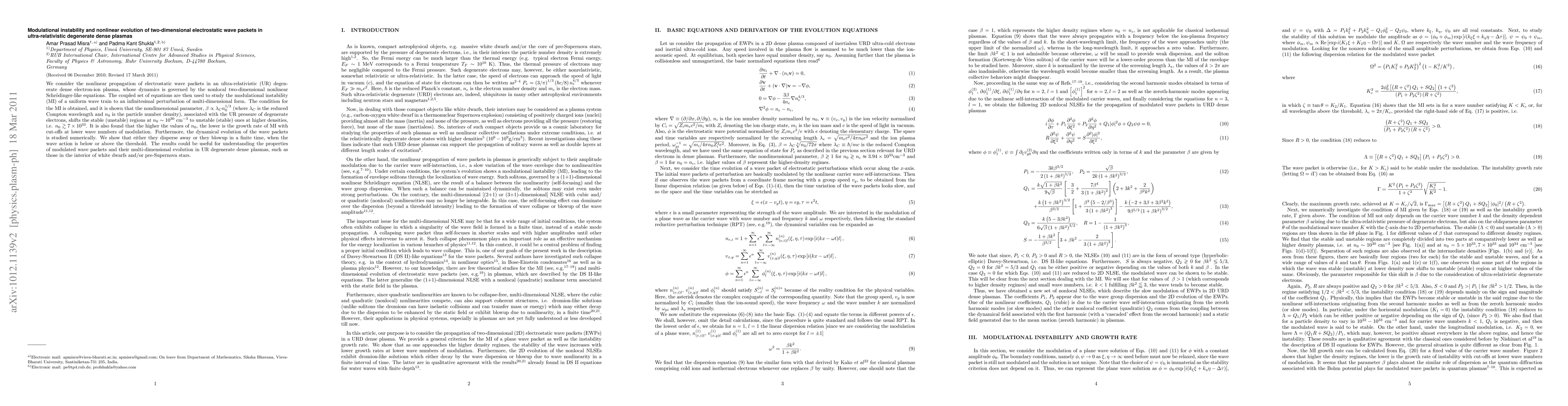 This paper investigates the modulational instability and nonlinear evolution of electrostatic wave packets in ultra-relativistic dense plasmas using nonlocal two-dimensional nonlinear Schrödinger-like equations. It finds that the parameter $\beta$ shifts stability regions and influences the growth rate of modulational instability, while numerical simulations show wave packets either disperse or blow up based on wave action thresholds.