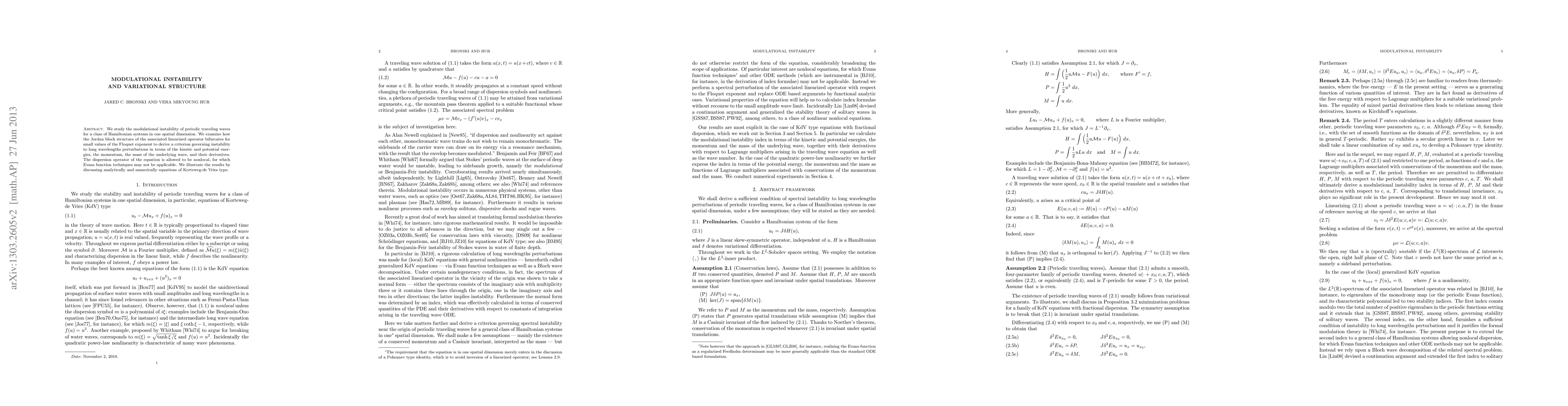 We study the modulational instability of periodic traveling waves for a class of Hamiltonian systems in one spatial dimension. We examine how the Jordan block structure of the associated linearized operator bifurcates for small values of the Floquet exponent to derive a criterion governing instability to long wavelengths perturbations in terms of the kinetic and potential energies, the momentum, the mass of the underlying wave, and their derivatives. The dispersion operator of the equation is allowed to be nonlocal, for which Evans function techniques may not be applicable. We illustrate the results by discussing analytically and numerically equations of Korteweg-de Vries type.