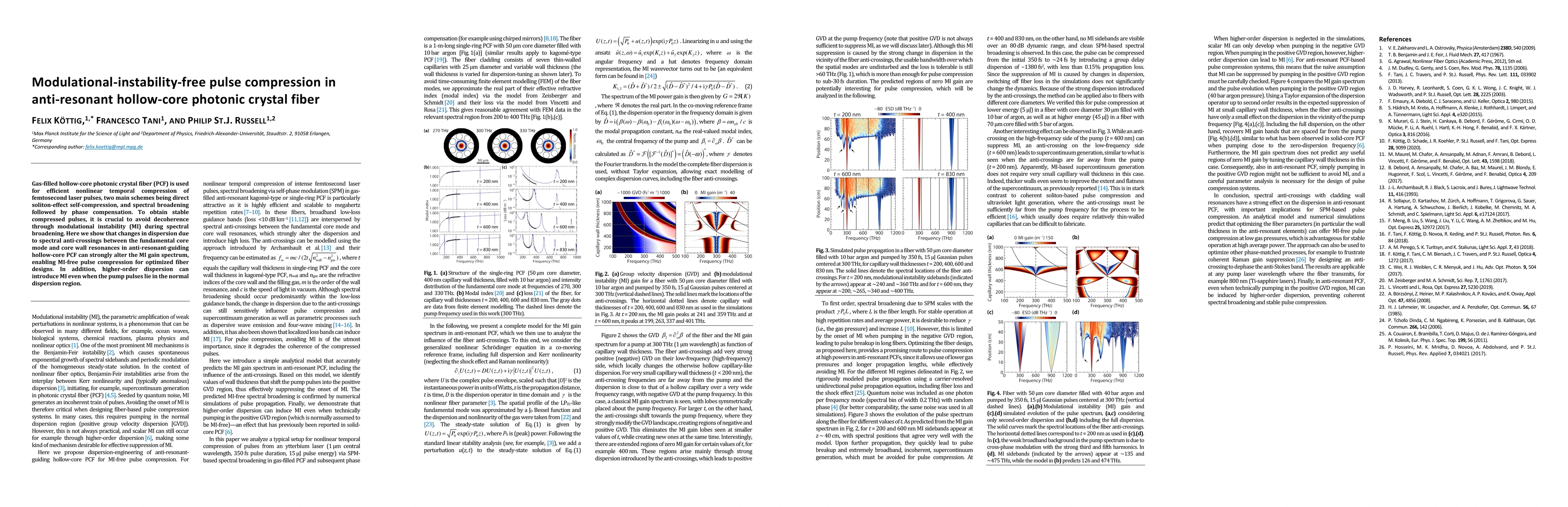 This paper explores efficient pulse compression in anti-resonant hollow-core photonic crystal fiber using gas-filling, avoiding modulational instability through altered dispersion due to spectral anti-crossings, and discusses the impact of higher-order dispersion on instability.