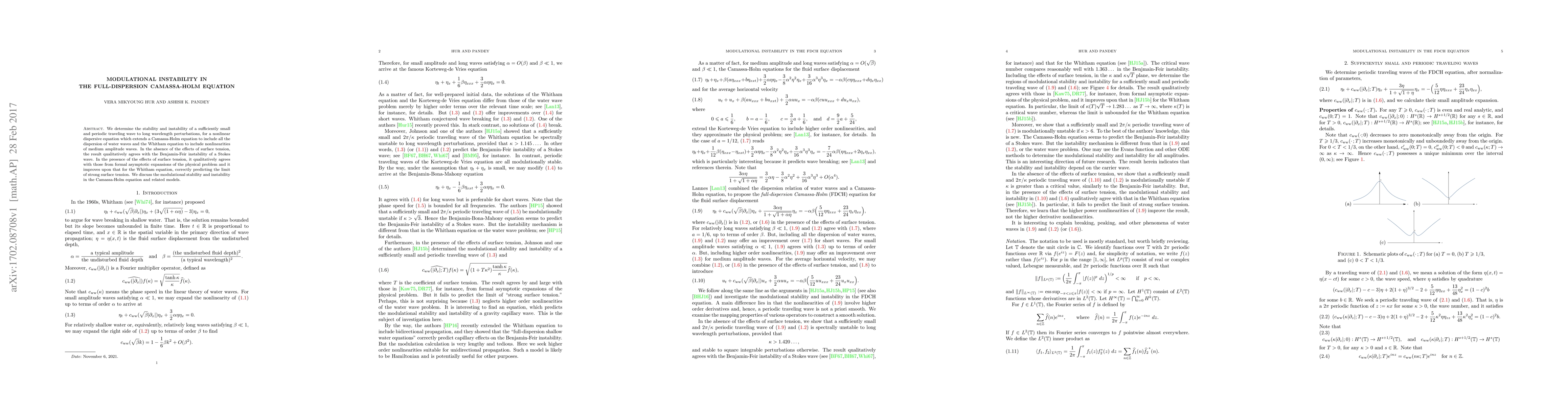 We determine the stability and instability of a sufficiently small and periodic traveling wave to long wavelength perturbations, for a nonlinear dispersive equation which extends a Camassa-Holm equation to include all the dispersion of water waves and the Whitham equation to include nonlinearities of medium amplitude waves. In the absence of the effects of surface tension, the result qualitatively agrees with the Benjamin-Feir instability of a Stokes wave. In the presence of the effects of surface tension, it qualitatively agrees with those from formal asymptotic expansions of the physical problem and it improves upon that for the Whitham equation, correctly predicting the limit of strong surface tension. We discuss the modulational stability and instability in the Camassa-Holm equation and related models.