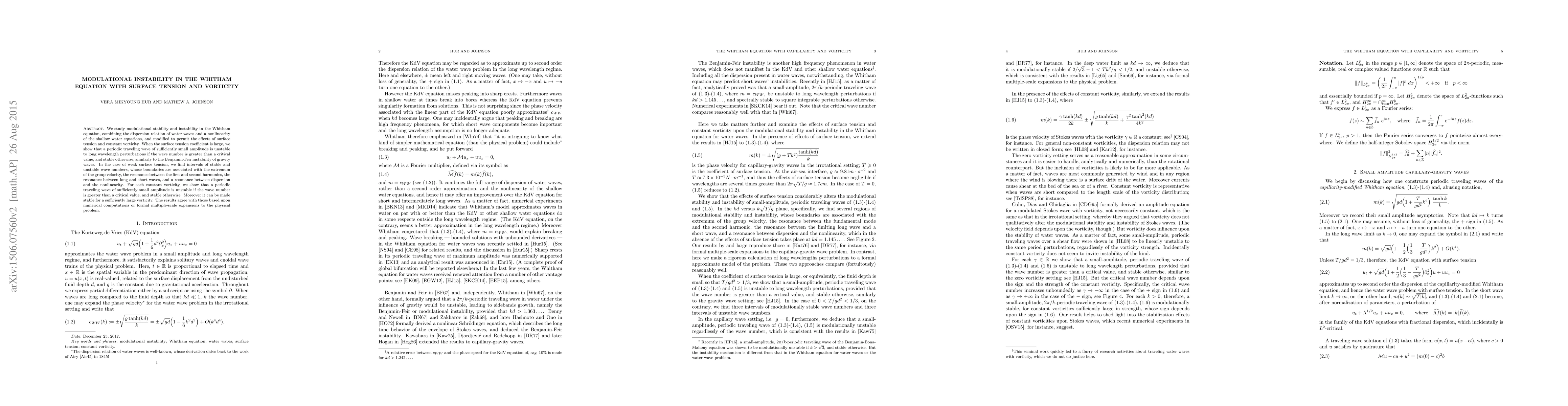 This paper investigates modulational stability in the Whitham equation, incorporating surface tension and vorticity effects. It finds that large surface tension leads to instability for small amplitude waves above a critical wave number, akin to Benjamin-Feir instability. For weak surface tension, stability varies with wave number, influenced by group velocity, harmonic resonances, and dispersion-nonlinearity interactions. Constant vorticity also induces instability above a critical wave number but can be mitigated with higher vorticity.