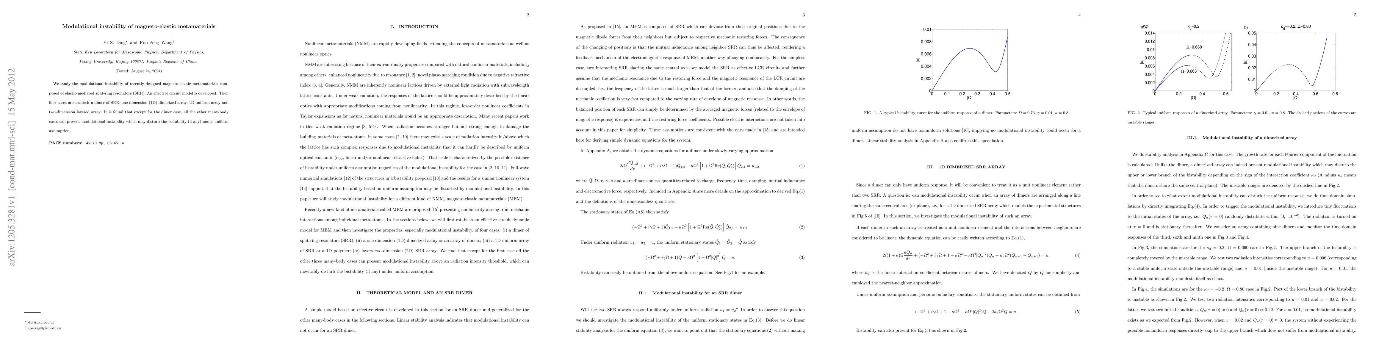 We study the modulational instability of recently designed magnetoelastic metamaterials composed of elastic-mediated split-ring resonators (SRR). An effective circuit model is developed. Then four cases are studied: a dimer of SRR, one-dimension (1D) dimerized array, 1D uniform array and two-dimension layered array. It is found that except for the dimer case, all the other many-body cases can present modulational instability which may disturb the bistability (if any) under uniform assumption.