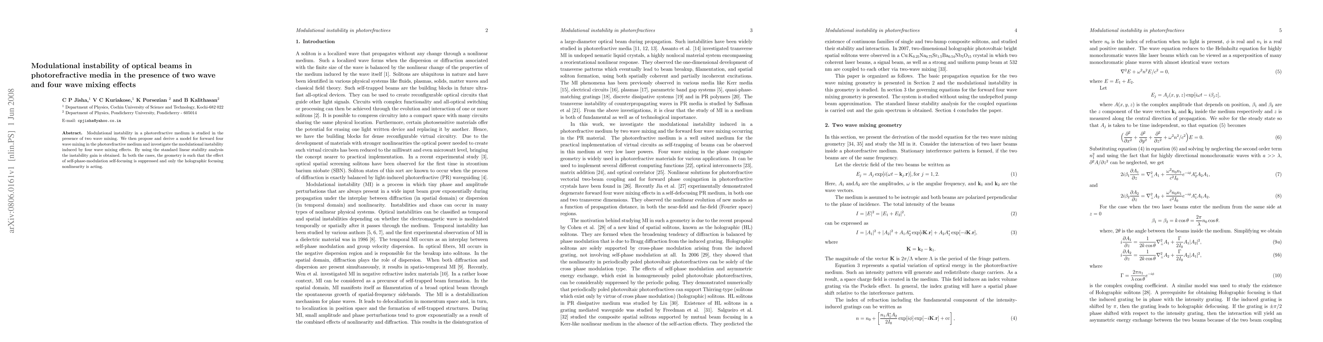 This paper investigates modulational instability in photorefractive media under two wave mixing and proposes a model for forward four wave mixing. It derives the instability gain using linear stability analysis, focusing on holographic nonlinearity without self-phase-modulation.