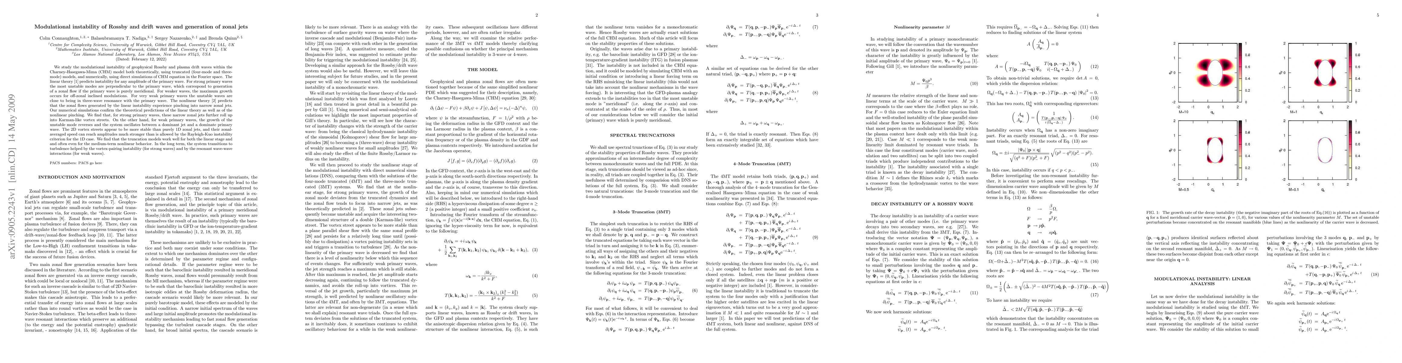 This paper investigates the modulational instability of Rossby and drift waves in the Charney-Hasegawa-Mima model, predicting the formation of zonal jets from unstable wave modulations. Numerical simulations confirm the theoretical predictions, showing the generation of narrow zonal jets and vortex streets, with vortex streets exhibiting greater stability and higher speeds than 1D jets.